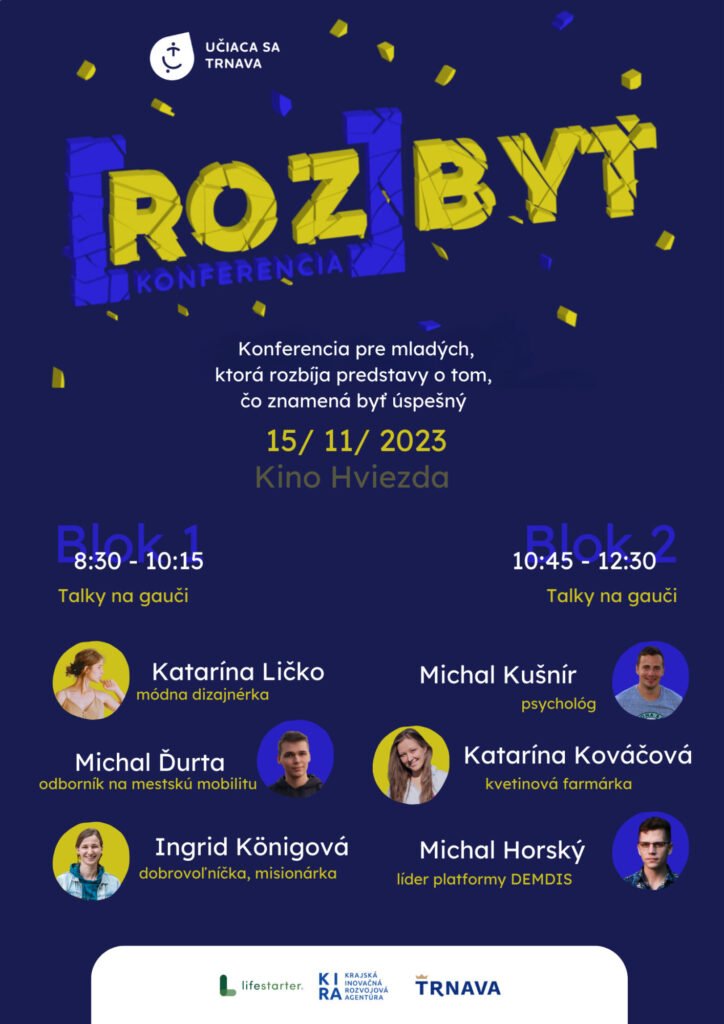 Na tieto a mnohé ďalšie otázky sa pokúsime nájsť odpovede počas konferencie [ROZ]BYŤ určenej nielen pre stredoškolákov, ktorá sa uskutoční 20. septembra v doobedných hodinách v Kine Hviezda v Trnave.