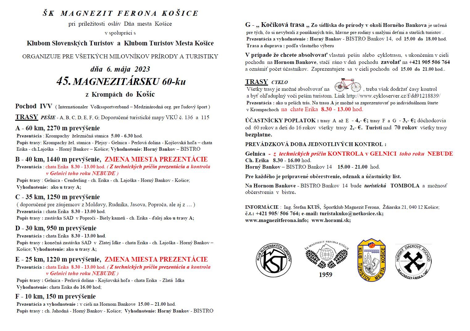 ŠK MAGNEZIT FERONA KOŠICE pri príležitosti osláv Dňa mesta Košice v spolupráci s Klubom Slovenských Turistov a Klubom Turistov Mesta Košice ORGANIZUJE PRE VŠETKÝCH MILOVNÍKOV PRÍRODY A TURISTIKY dňa 6. mája 2023 45. MAGNEZITÁRSKU 60-ku z Krompách do Košíc