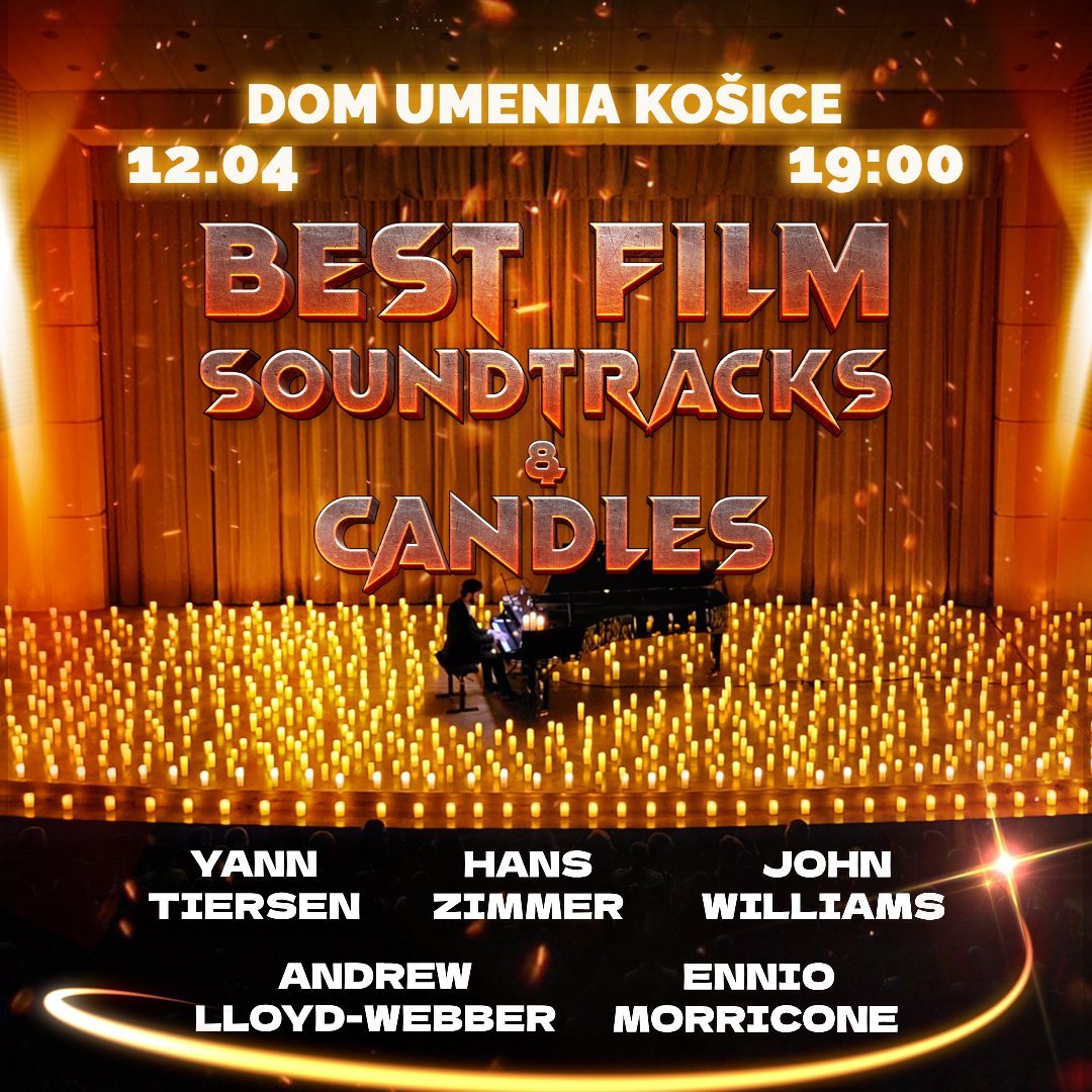 Jedinečný večer v žiari tisícich sviečok v Dome Umenia v Košiciach na ktorom sa zvuky klavíra spoja s hudobnými kompozíciami legendárnych filmov. V krásnej sále Domu umenia vás čaká nezabudnuteľný koncert, na ktorom zaznejú najznámejšie diela veľkých skladateľov, ako sú: Jan Tiersen, Hans Zimmer, John Williams, Andrew Lloyd Webber, Ennio Morricone a ďalší.