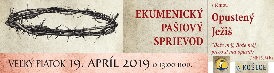 Ekumenické spoločenstvo cirkví a náboženských spoločností na území mesta Košice, pripravuje 25. Ekumenický Pašiový sprievod na Veľký piatok 19.4.2019 so začiatkom o 13.00 hod., pred Evanjelickým chrámom a.v., Mlynská č. 23, v Košiciach.