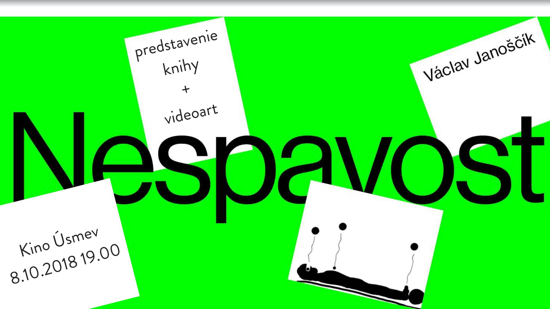Filozof Václav Janoščík predstaví svoju najnovšiu knihu Nespavost (2018), v ktorej sa skrz reflexiu insomnie snaží vymedziť určité filozofické východisko voči súčasnosti. Po prednáške premietneme pásmo videoartu k téme nespavosti v kurátorskom výbere Václava Janoščíka (Nikola Ivanov "Americká Noc", Cecile B Evans "Hyperlinks or it didnt happen", a.i.)