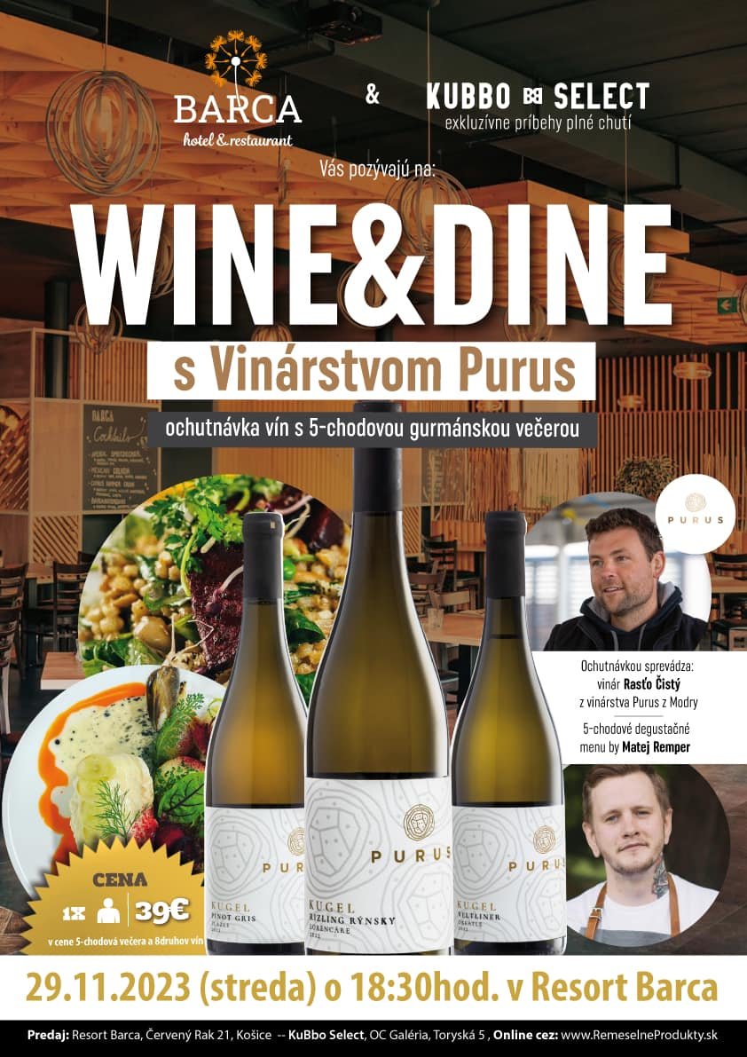 V rámci ochutnávky vína Wine & Dine sa budú snúbiť vína z butikového vinárstva Purus z Modry s kuchyňou Resortu Barca pod taktovkou šéfkuchára Mateja Rempera. Počas večera sa predstaví rada vín Purus Kugel, ako aj mladé vína ročníka 2023!