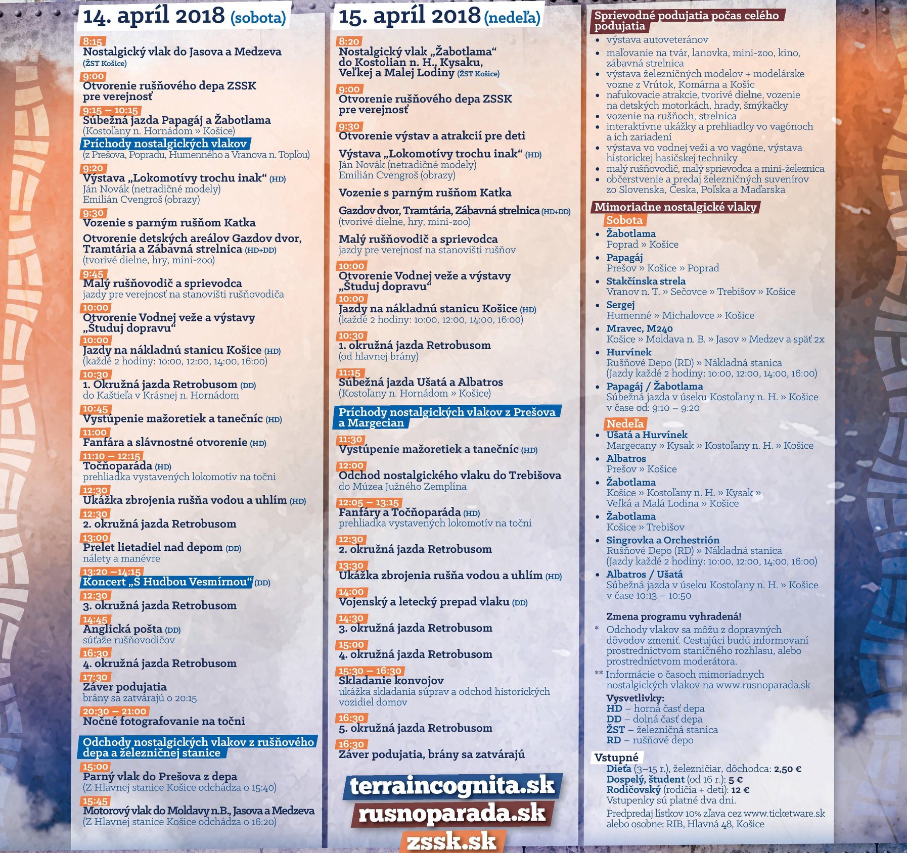 Vstupenky získate priamo pri hlavnom vstupe do depa, na online predpredaji alebo pri zakúpení cestovného v mimoriadnych nostalgických vlakoch, ktoré zapezpečujú návoz priamo do areálu. Výťažok zo vstupného ide na záchranu historickej železničnej techniky a na organizáciu podujatia. Na podujatí sú okrem historickej a súčasnej železničnej techniky aj viac ako dve desiatky sprievodných aktivít a atrakcií či vystúpení.