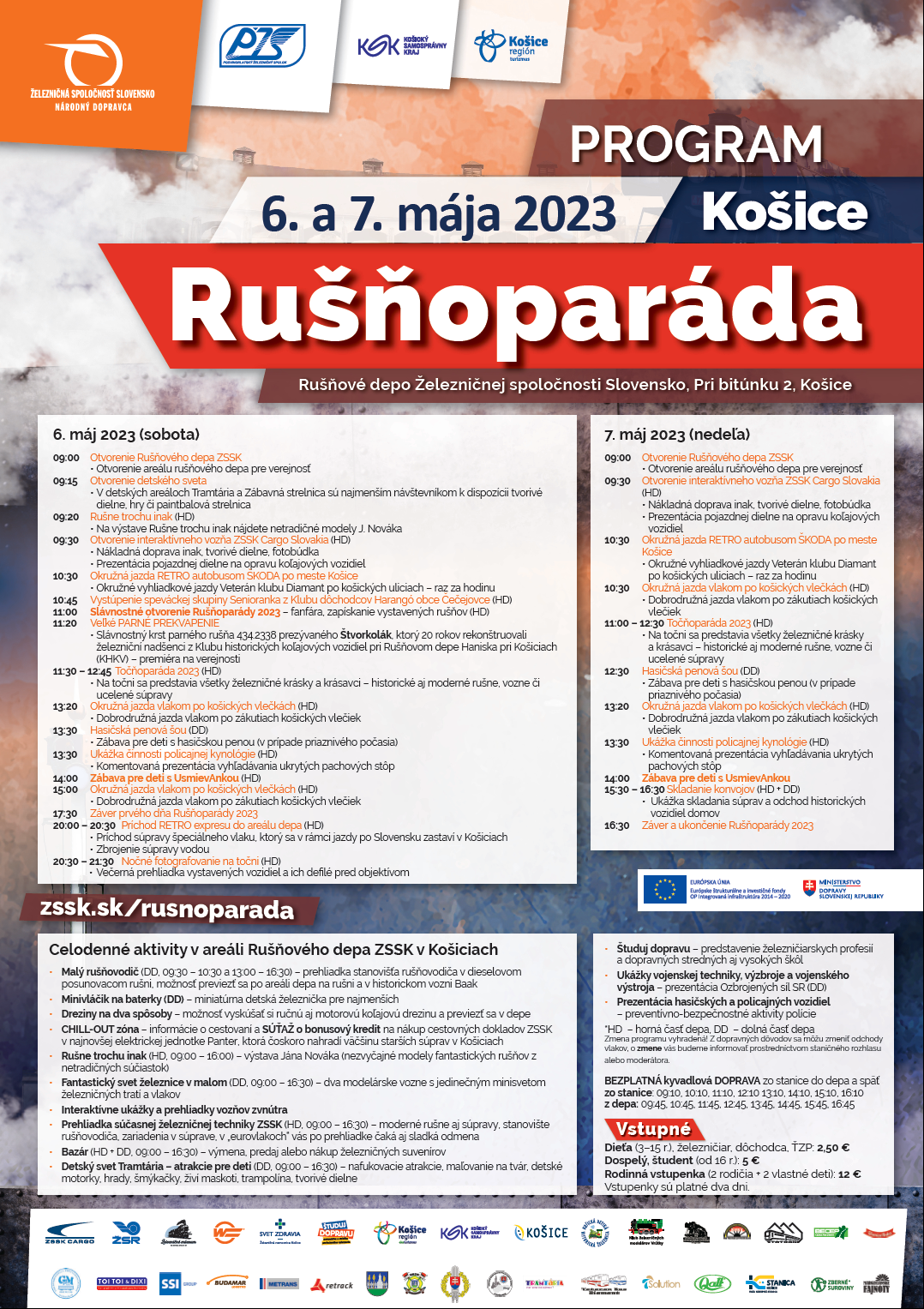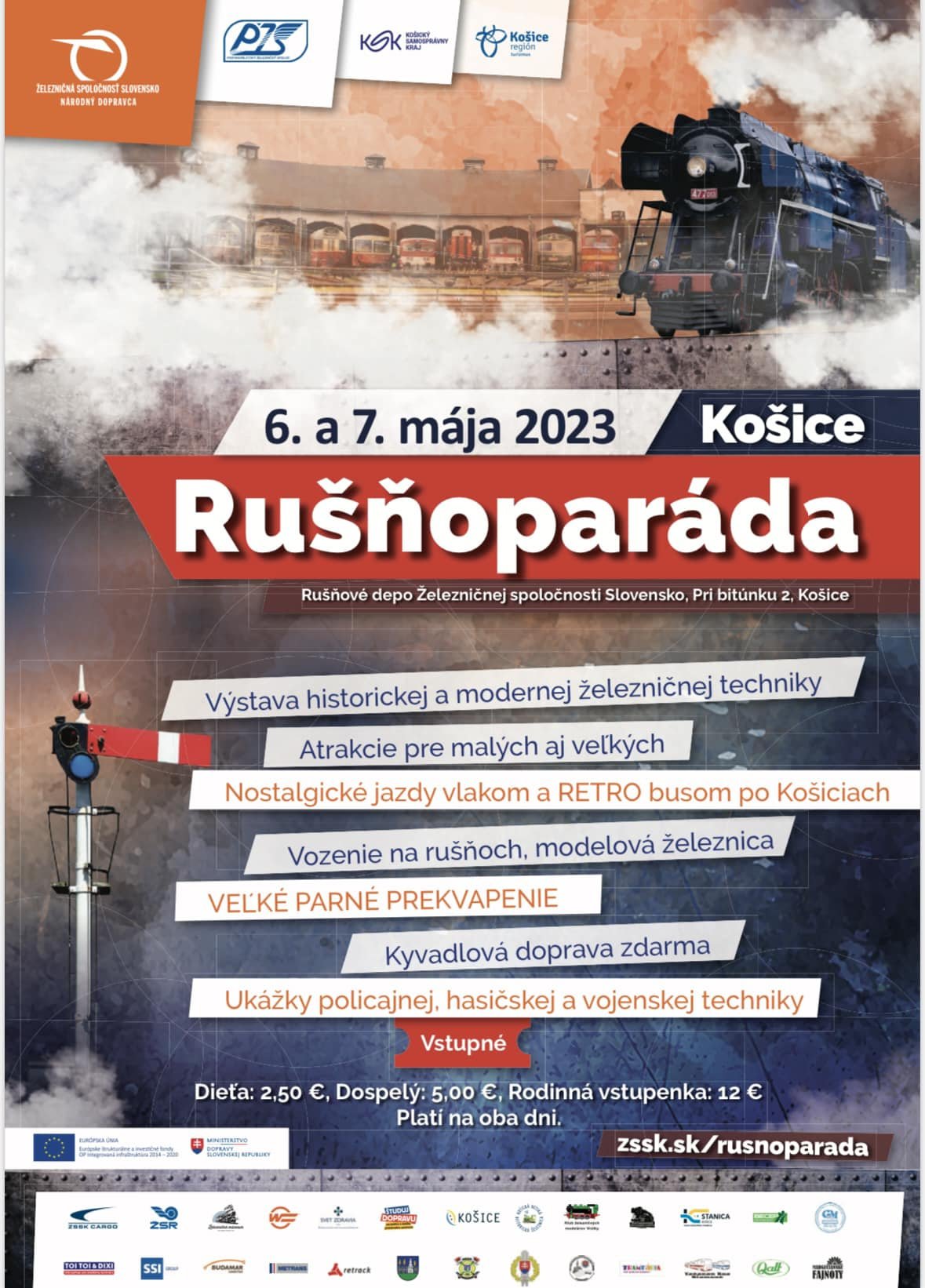 Tisíckam záujemcov sa už po jubilejný dvadsiaty raz otvorí rušňové depo ZSSK v Košiciach. Národný dopravca, Železničná spoločnosť Slovensko (ZSSK) v spolupráci s občianskymi združeniami železničnej nostalgie privíta 6. – 7. mája 2023 návštevníkov na tradične najväčšej prezentácii historických i súčasných železničných vozidiel na Slovensku „RUŠŇOPARÁDA 2023“.