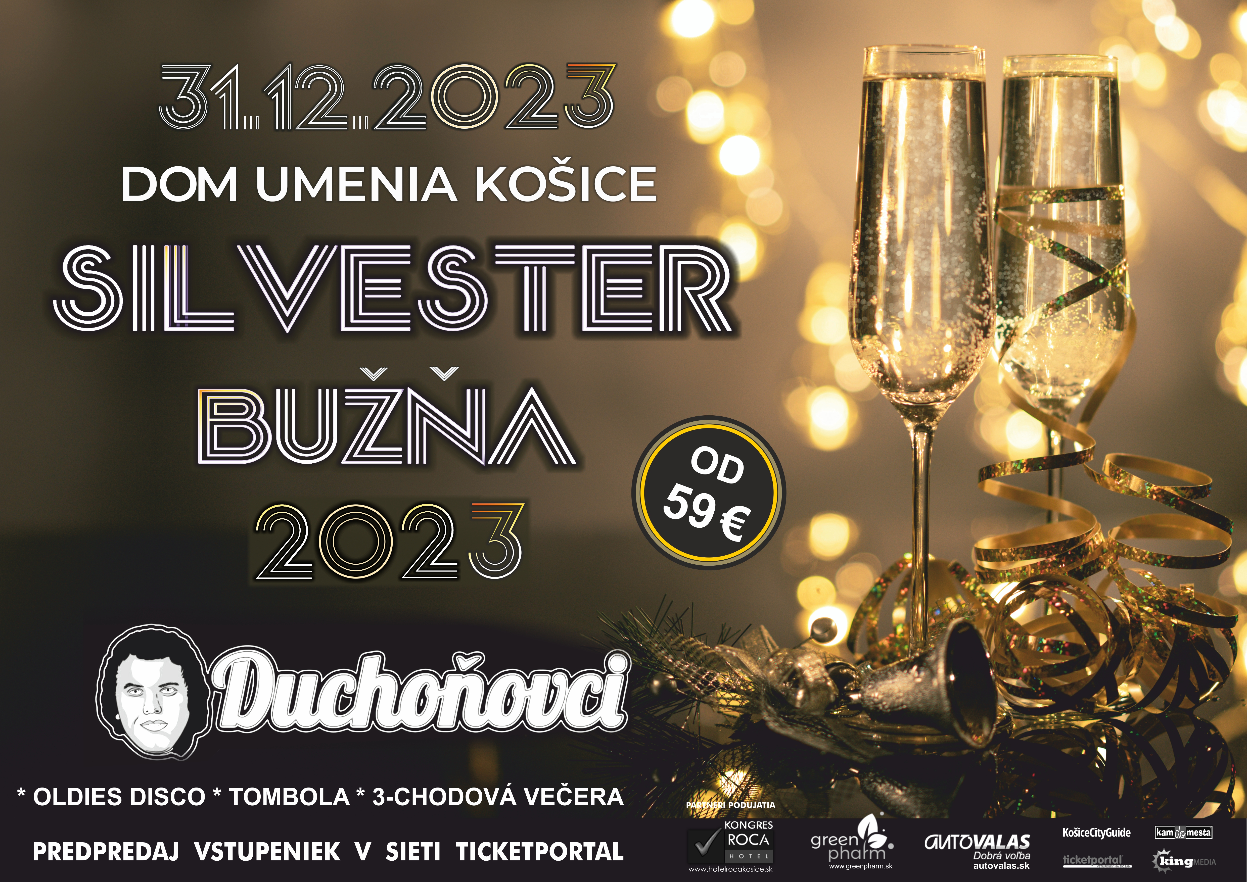 Príďte osláviť príchod Nového roka už tradične v historických priestoroch košického Domu umenia. Do rána Vás budú zabávať a hrať Vám tie najväčšie hity Karola Duchoňa skupina DUCHOŇOVCI, Grimmy Dance Show, košickí DJs a ďalší hostia. Čaká vás skvelá hudba, zábavný program, bohatá tombola a chutná trojchodová večera.