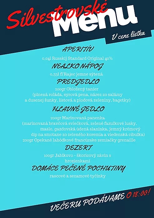 Čaká Vás skvelé jedlo, šampanské, aperitívy, diskotéka a tombola! Lístky si môžete zakúpiť na prevádzke v kancelárii vedúceho.