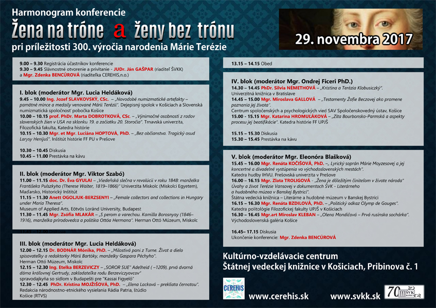 Centrum pre religionistiku a historické štúdiá, n. o. Štátna vedecká knižnica v Košiciach Vás pozývajú na interdisciplinárnu vedeckú konferenciu Žena na tróne a ženy bez trónu pri príležitosti 300. výročia narodenia Márie Terézie Konferencia sa uskutoční 29. novembra 2017 v Kultúrno-vzdelávacom centre Štátnej vedeckej knižnice v Košiciach, Pribinova č. 1