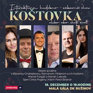 Decembrová predvianočná Koštovka bude veselá. Hostitelia programu herečka a moderátorka Bibiana Ondrejková a hudobník a herec Roman Féder privítajú hostí: moderátora, zabávača, glosátora Marcela Forgáča a skvelého herca Mariána Labudu.