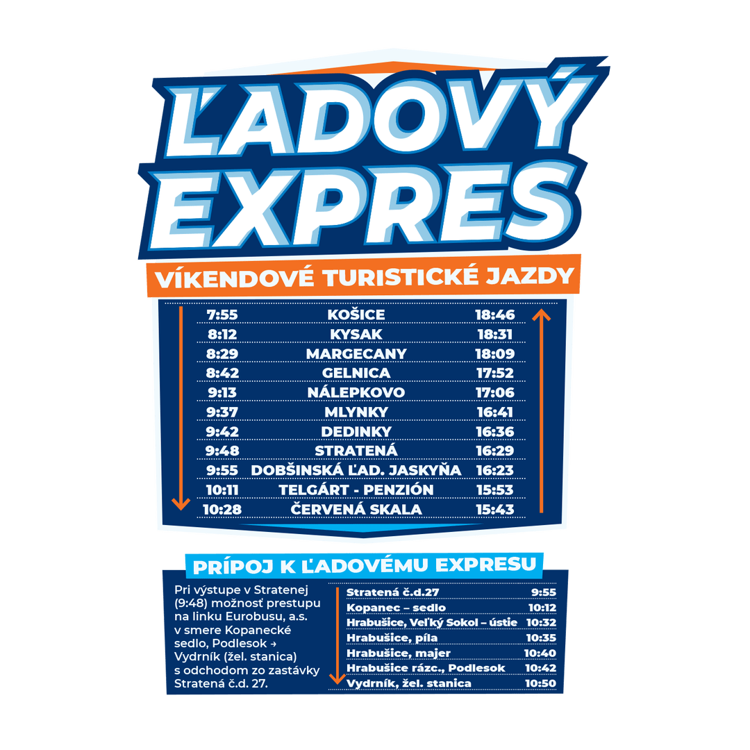 Od začiatku školských prázdnin budú môcť turisti na cestu do NP Slovenský raj využiť jediný priamy vlakový spoj. Obľúbený Ľadový expres bude premávať každú sobotu až do 31.8.2019 (vrátane) na trase Košice – Kysak – Margecany – Gelnica – Nálepkovo – Mlynky – Dedinky – Stratená – Dobšinská ľadová jaskyňa – Telgárt, penzión – Červená Skala a späť. Vlani toto priame spojenie Košíc s južnou časťou Slovenského raja zožalo obrovský úspech a inšpirovalo viaceré slovenské regióny k zavedeniu podobných produktov.