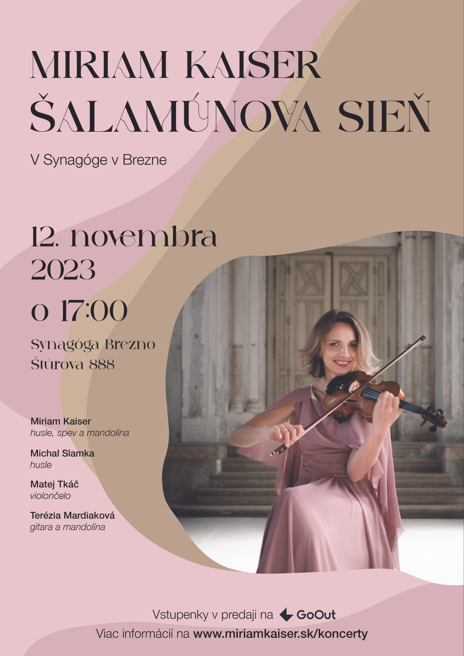hudobníkmi prináša koncertné akustické prevedenie hudobného projektu Šalamúnova sieň. Poslucháči si tak budú môcť vypočuť skladby a piesne inšpirované biblickými textami doplnené o obľúbené skladby predchádzajúcich albumov. Miriam vystupuje s trojicou profesionálnych hudobníkov hrajúcich na strunové nástroje: Michal Slamka - husle, Matej Tkáč - violončelo a Terézia Mardiaková - gitara a mandolína. Vo svojich piesňach a inštrumentálnych skladbách vychádza zo znalostí klasickej hudby, ale zároveň sa nevyhýba ani ľudovej spevavosti, či inšpiráciám z populárnej hudby a pesničkárstva. Dôležitou súčasťou zvuku sú tiež poetické a duchovne ladené texty. Predaj lístkov cez GOOUT, alebo v Infocentre vo zvonici v Brezne, Námestie M.R.Štefánika 40.
