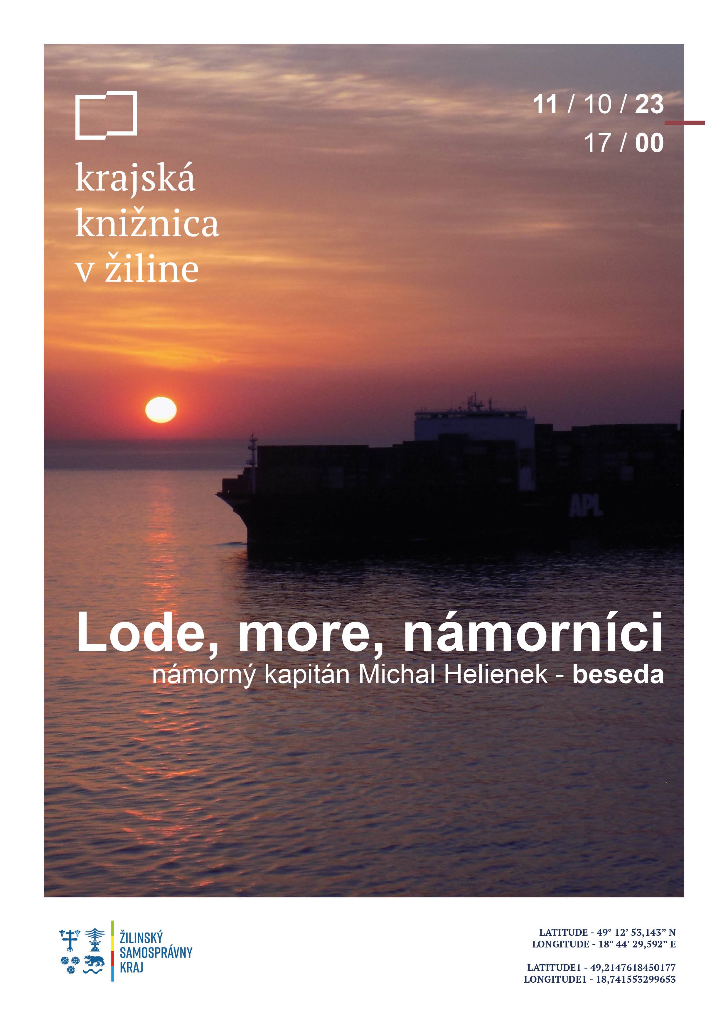 Pozývame vás na nezabudnuteľné dobrodružstvo na mori – Lode, more, námorníci. Príďte a ponorte sa do sveta gigantických kontajnerových lodí, ktoré preplavujú svetové oceány. Zistite, aké to je byť kapitánom jednej z týchto nádher a počúvajte príbehy o živote, práci a námornej romantike. Námorný kapitán Michal Helienek vás prevedie svojím fascinujúcim svetom pomocou obrazov i slov. Zabudnite na stereotypy a pozrite sa na život na mori zblízka, tešíme sa na vás 11. októbra o 17:00 v Krajskej knižnici v Žiline.
