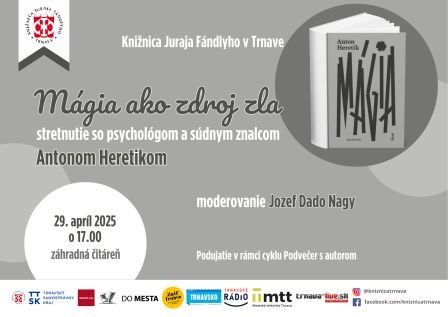 Pozývame vás na stretnutie s psychológom a súdnym znalcom Antonom Heretikom. Podujatie bude moderovať Jozef Dado Nagy a témou ich rozhovoru bude kniha Mágia ako zdroj zla, ktorá je pokračovaním jeho série - Zlo, Humor, Sny, Narcizmus, Dobro, Smrť.