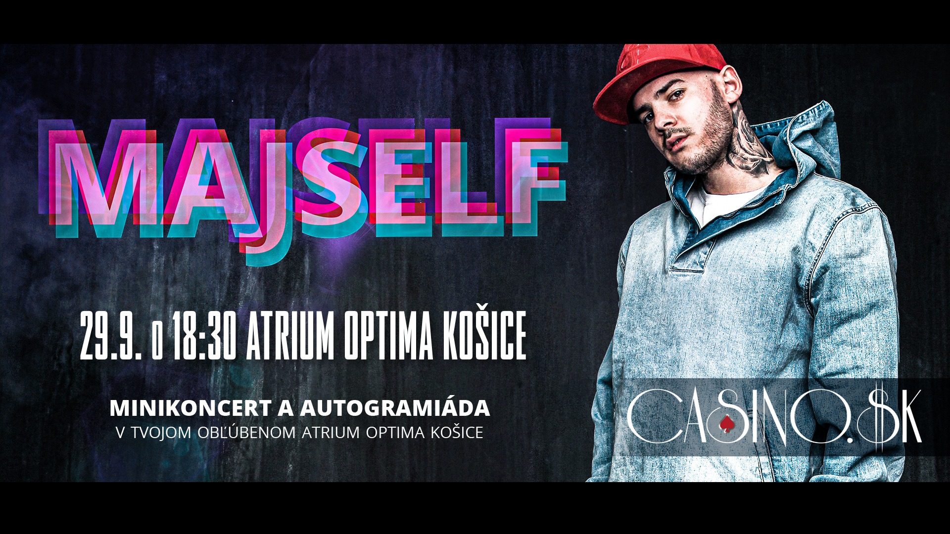 Po premietaní filmu Casino.sk vás všetkých Majself privíta na koncerte a autogramiáde v obchodnom centre zo začiatkom o 18:30h. Po koncerte odovzdá špeciálnu cenu jednému z vás.