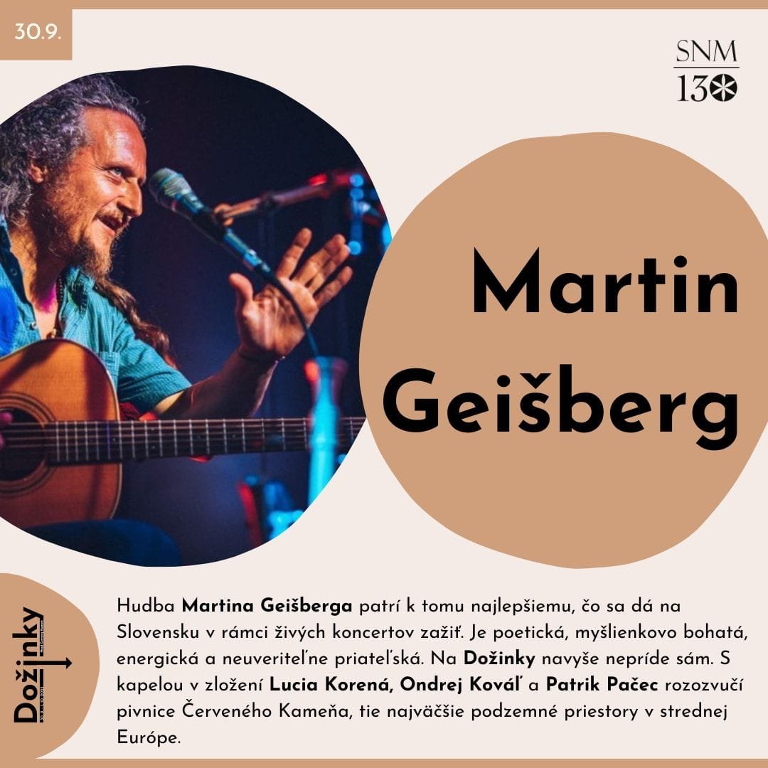 Martin Geišberg je originálny hudobník, dramaturg a textár, nositeľ ocenenia Radio_Head Awards 2019. Na Dožinky navyše nepríde sám. S kapelou v zložení Lucia Korená, Ondrej Kováľ a Patrik Pačec rozozvučí počas Dožiniek červenokamenské pivnice, ktoré patria medzi najväčšie podzemné priestory v strednej Európe.