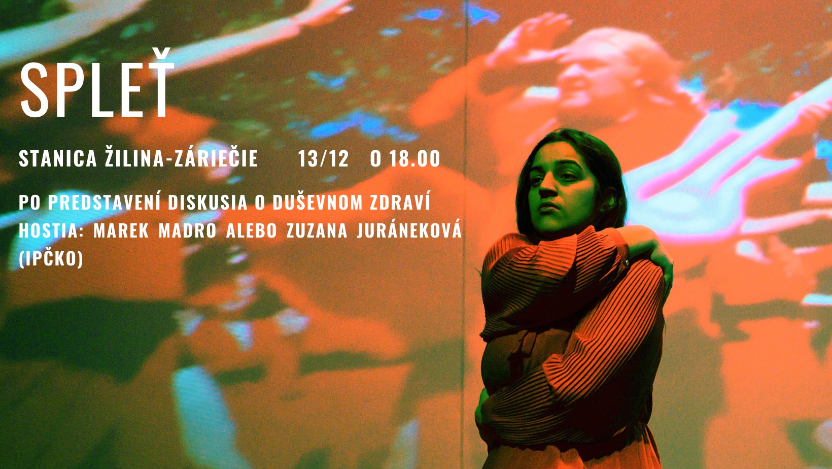 V stredu 13. decembra o 18.00 sa na Stanici Žilina-Záriečie predstaví Divadelné centrum s inscenáciou autorskej hry Jána Šimka Spleť, ktorá spája divadlo, psychológiu, mladých ľudí a diskusiu do jedného konceptu. Spleť je autentickým príbehom mladej Rómky, ktorá je pre svoj pôvod a originálne názory vystavená kyberšikane.