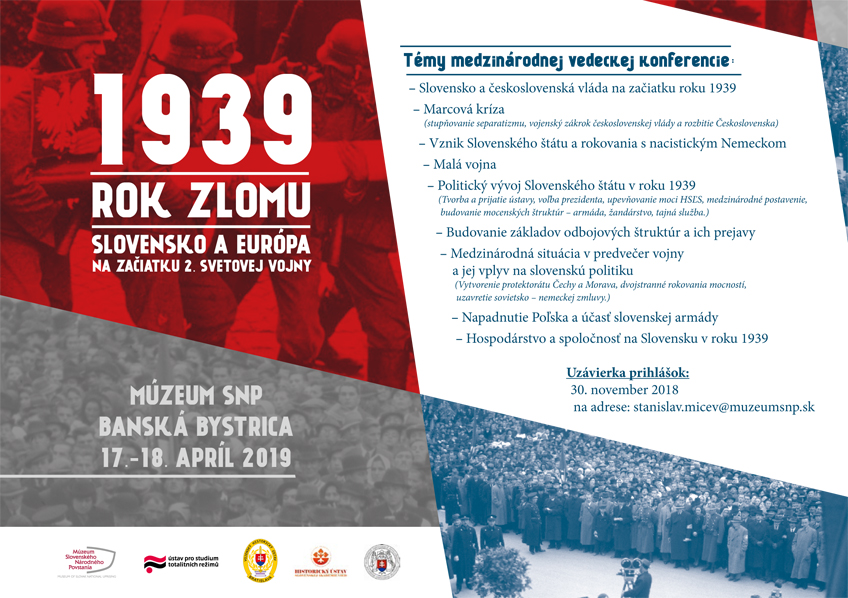 Múzeum Slovenského národného povstania pripravuje v roku 2019 medzinárodnú vedeckú konferenciu 1939 – Rok zlomu. Slovensko a Európa na začiatku 2. svetovej vojny. Konferencia sa uskutoční 17. a 18. apríla v Múzeu SNP v Banskej Bystrici.