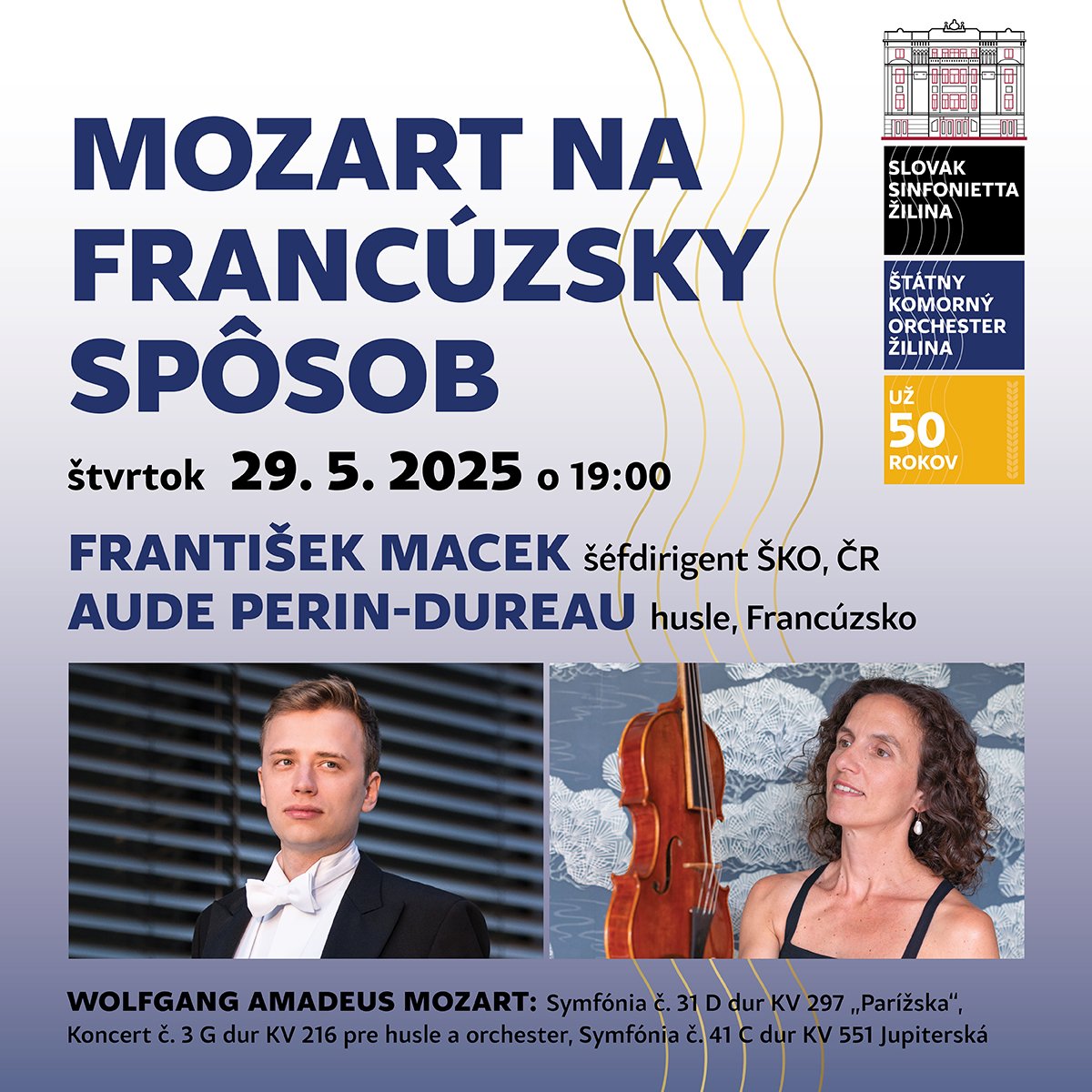 Posledný zo šiestich premiérových programov šéfdirigenta ŠKO Františka Macka je zostavený výlučne z tvorby najhrávanejšieho autora v histórii ŠKO – Wolfganga Amadea Mozarta. Spojovateľom s Francúzskom je úvodná Symfónia č. 31 Parížska, ktorá dostala názov podľa miesta vzniku diela v roku 1778. Ako sólistku si pozval významnú francúzsku huslistku Aude Perin Dureau, ktorá okrem sólistických a komorných vystúpení pôsobí v Ópera Orchestre National de Montpellier.