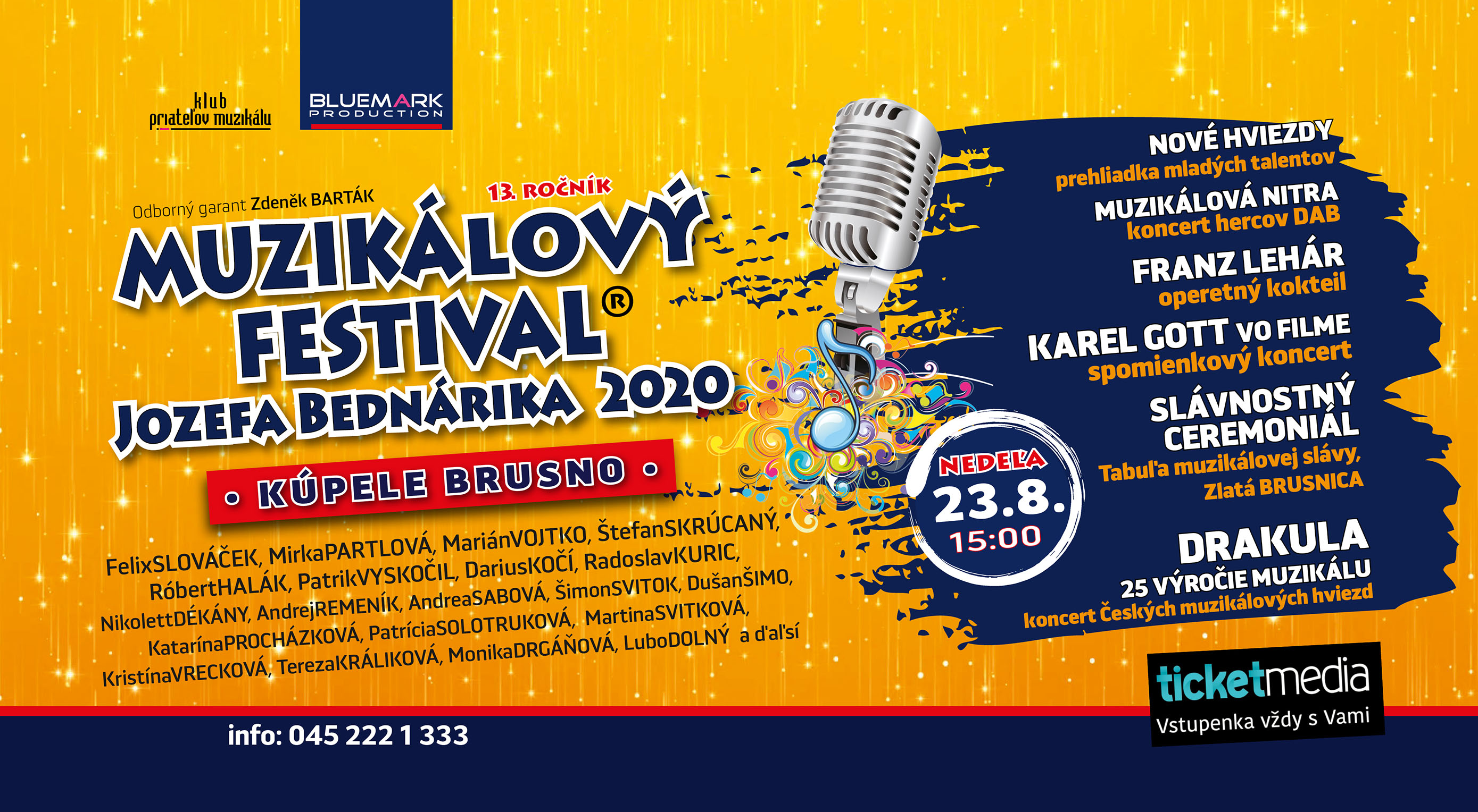 Milovníci muzikálov, šansónov, filmovej a divadelnej hudby i kabaretov sa tento rok stretnú na 13. ročníku Muzikálovom festivale Jozefa Bednárika v Kúpeľoch Brusno, 22. a 23. augusta 2020. Vstupenky sú predaji v sieti ticketmedia.sk.