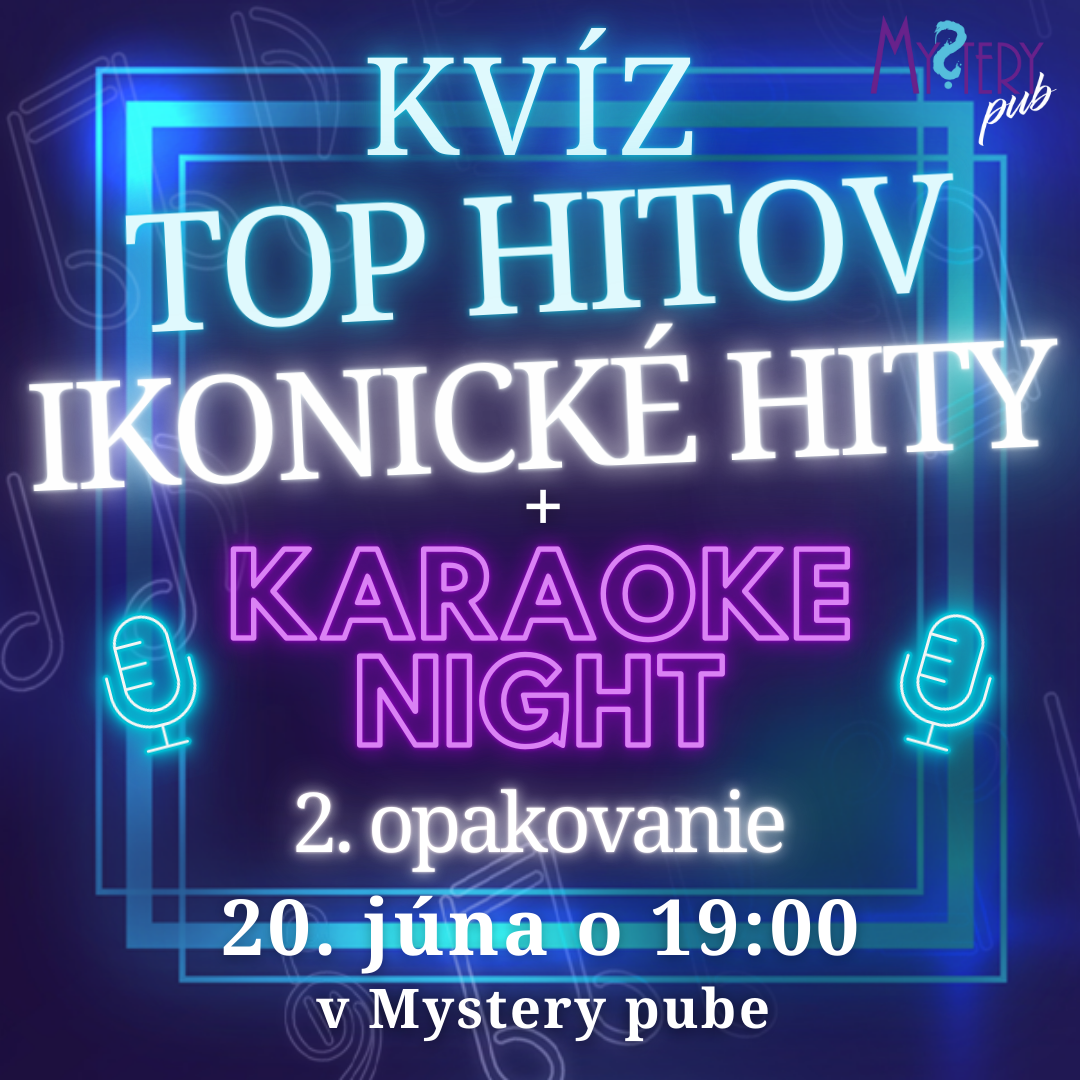Pripravili sme pre vás ďalší hudobný Mystery kvíz, tentokrát len zikonických hitov! V čo je to iné, ako hudobné ikony? Pozrieme sa poriadne na svetové hitparády, okrem veľkých mien vás budú čakať aj tie menšie a nebudú chýbať ani one-hit wonders. Poďte sa zabaviť do Mystery pubu, overiť si hudobné vedomosti v kvíze a potom sa môžeme zabávať až do 4tej rána na karaoke.