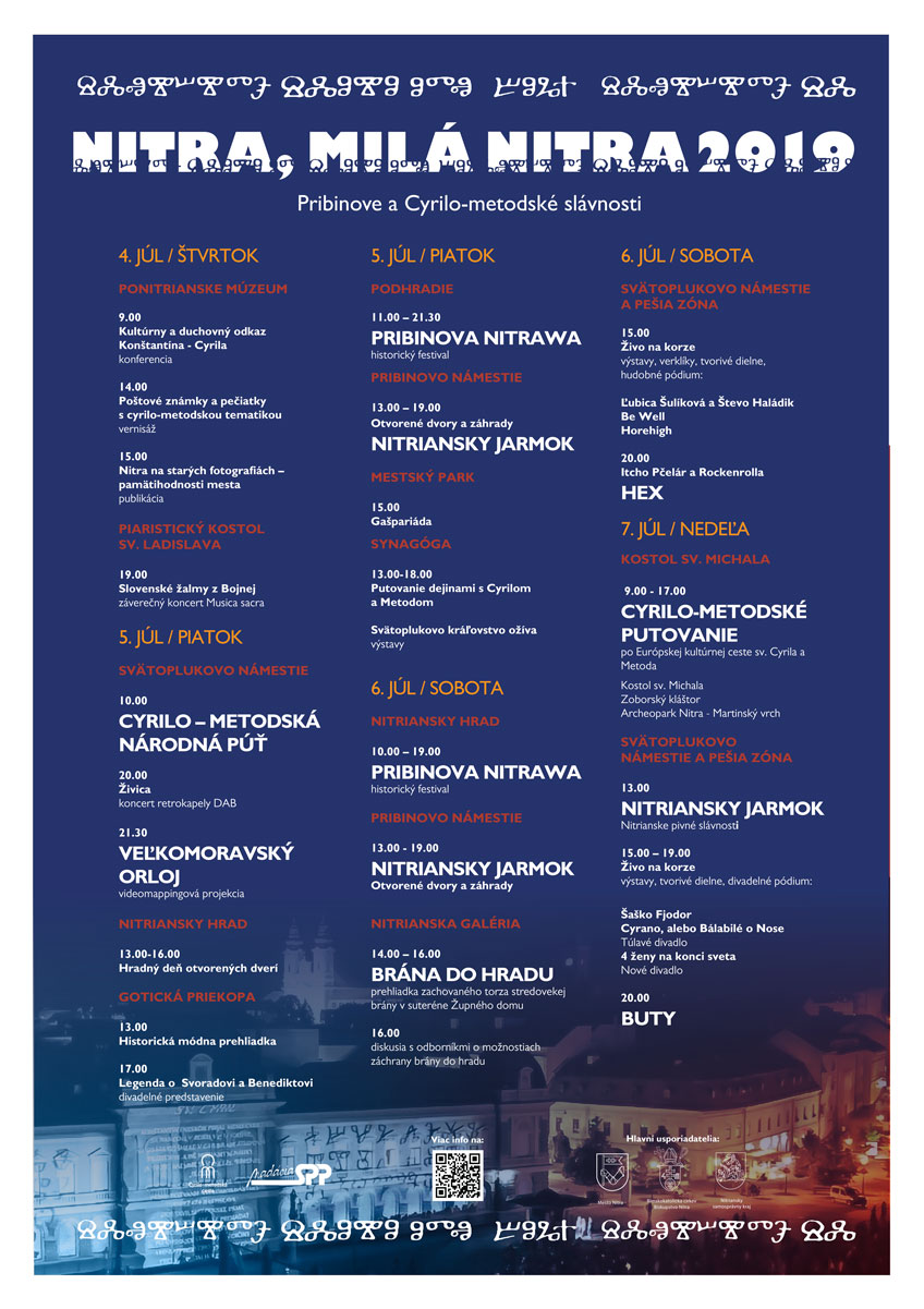 Historickú líniu slávností v tomto roku tvorí konferencia venovaná 1150. výročiu smrti Konštantína filozofa, historický festival Pribinowa Nitrava, otvorené dvory v hornom meste a prezentácia Nitrianskeho hradu ako najväčšieho hradu na Slovensku spolu s jeho vstupnou bránou ukrytou v suteréne Župného domu, veľkoplošná videomappingová a divadelná show Veľkomoravský orloj, hradný deň otvorených dverí, divadelné predstavenia, výstavy, prednášky, tvorivé dielne i putovanie s veľkomoravskou tematikou. Koncertom Slovenské žalmy z Bojnej symbolicky spájame Nitru s touto významnou lokalitou na trase Európskej kultúrnej cesty sv. Cyrila a Metoda.