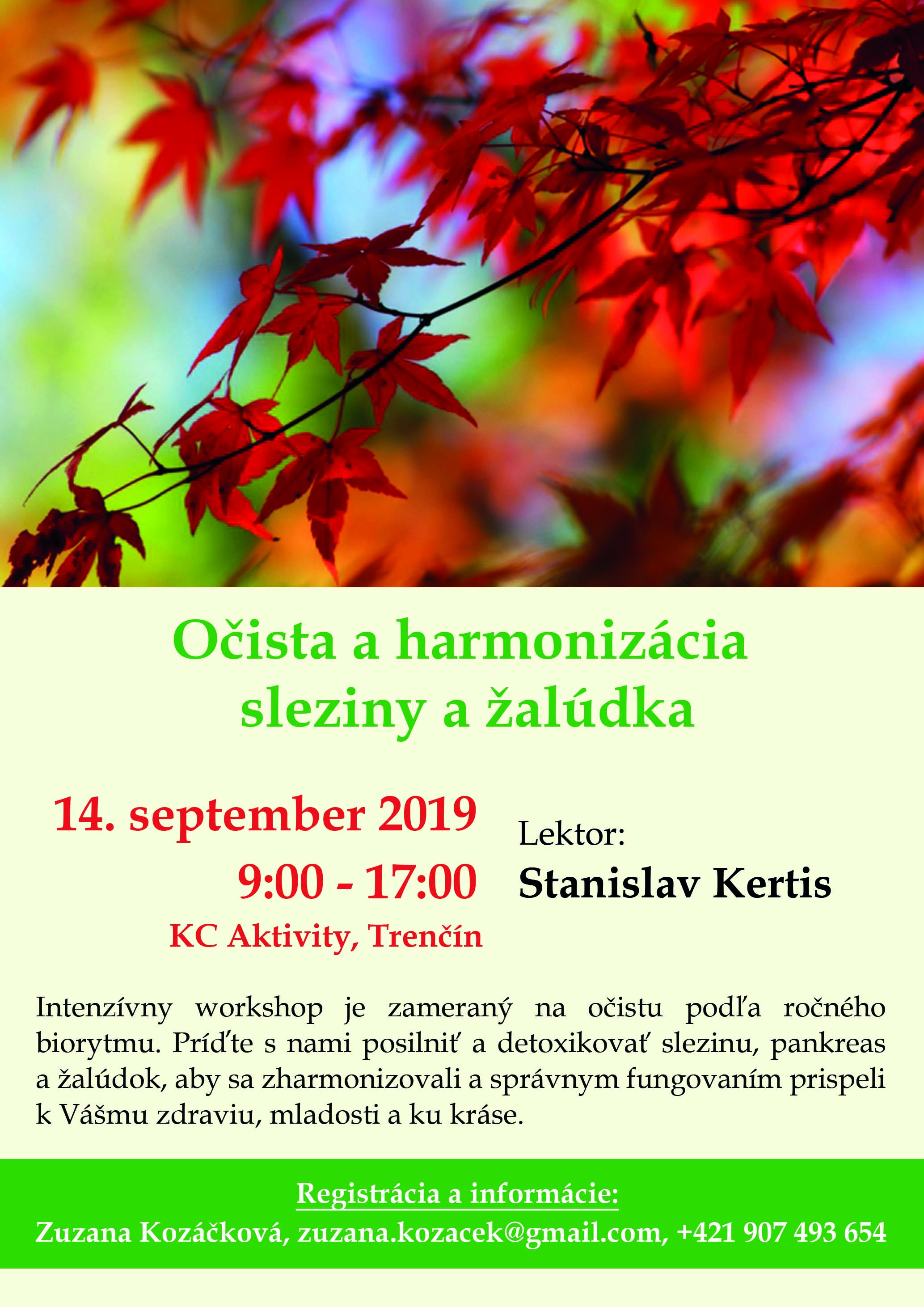 Intenzívny jednodňový kurz zameraný na jesennú očistu podľa ročného biorytmu. Príďte s nami posilniť a detoxikovať slezinu, slinivku a žalúdok, aby sa zharmonizovali a správnym fungovaním prispeli k Vášmu zdraviu, mladosti a kráse.