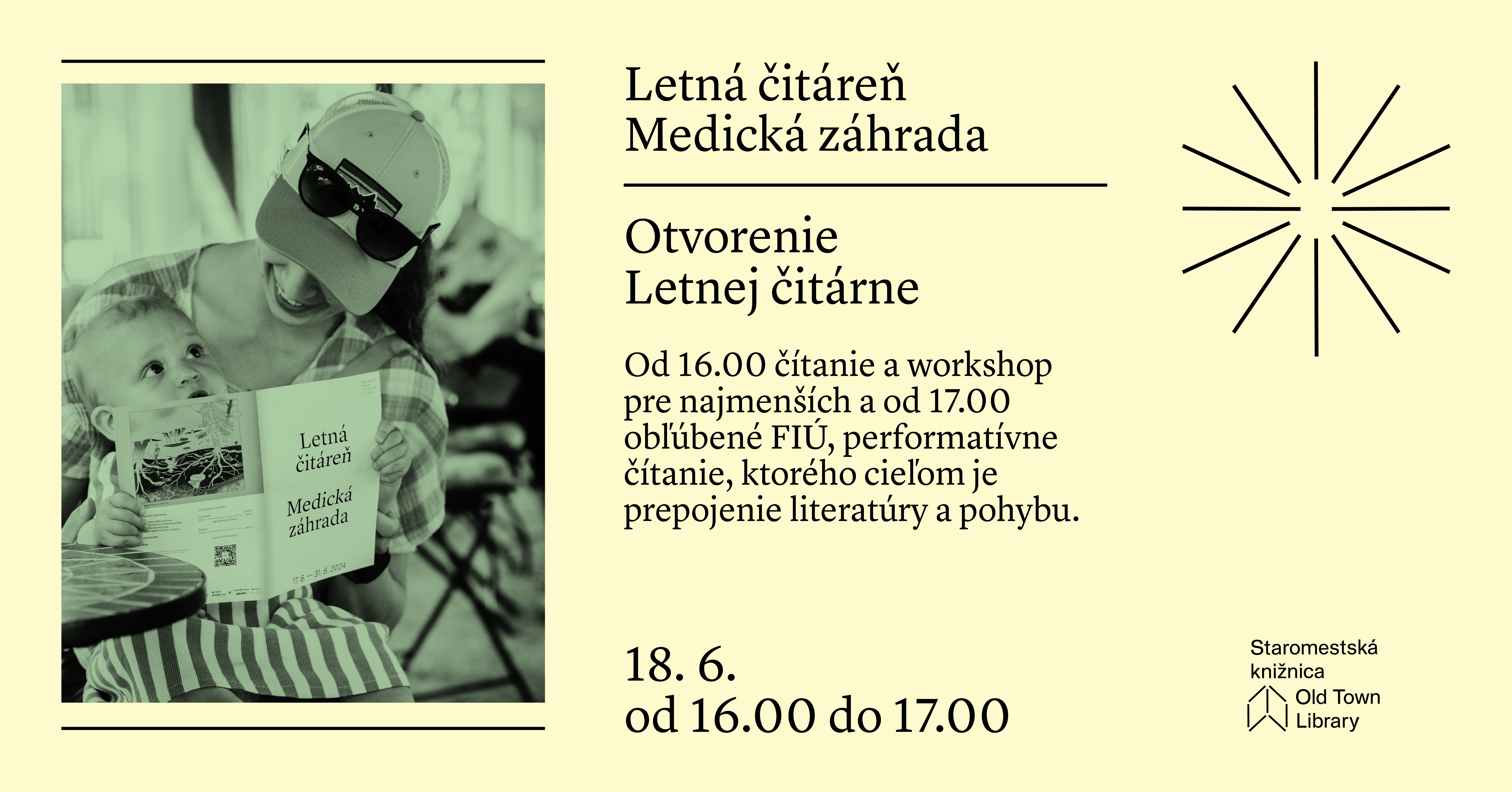 Otvorte spolu s nami našu Letnú čitáreň v Medickej záhrade! Otvorenie sa koná 18. júna s tým, že od 16.00 sa môžete tešiť na čítanie a workshop pre najmenších a od 17.00 na obľúbené Fiú, performatívne čítanie, ktorého cieľom je prepojenie literatúry a pohybu.