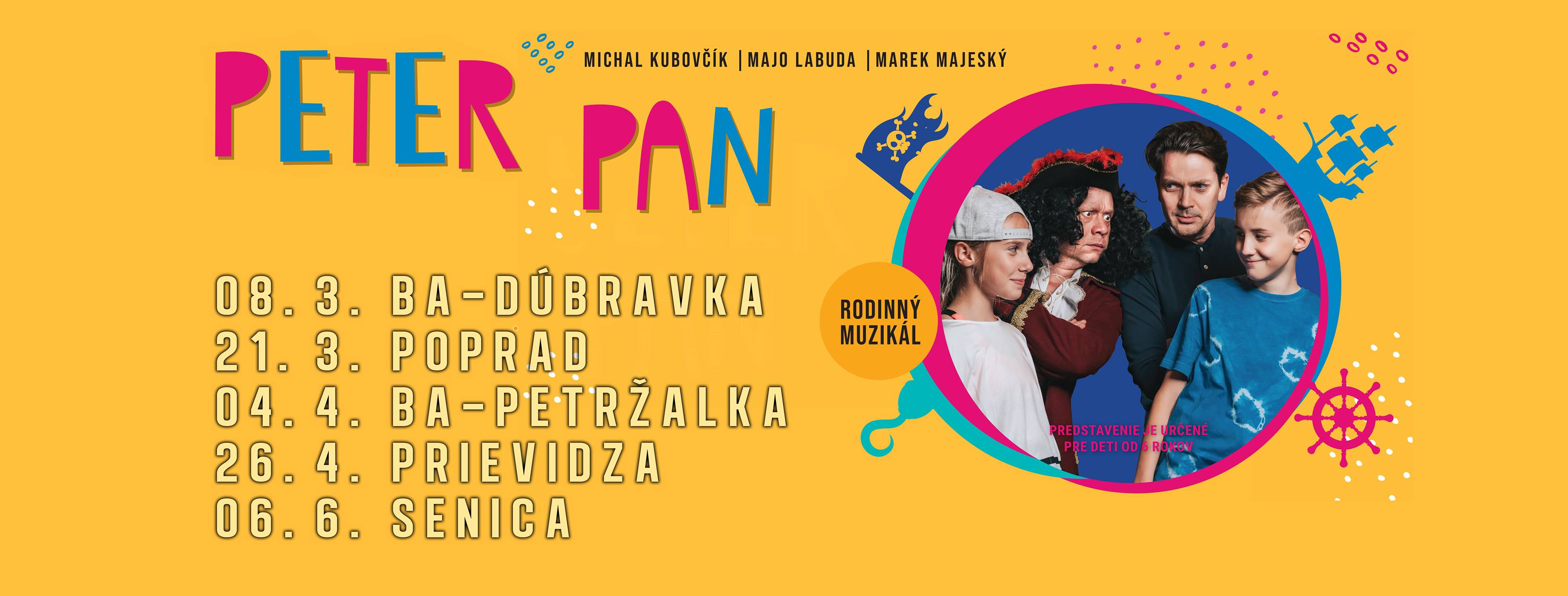 Na divadelné dosky sa vracia rodinný muzikál Peter Pan. Malí aj veľkí diváci sa opäť nechajú vtiahnuť do magického sveta, v ktorom proti sebe bojuje zákerný Hook a jeho banda pirátov s večným dieťaťom Petrom Panom a jeho bláznivými kamarátmi. Výnimočné spojenie detských hercov s profesionálnymi dospelými umelcami, v príbehu plnom detskej radosti, priateľstva, fantázie a divadelnej mágie, sľubuje nezabudnuteľný zážitok.