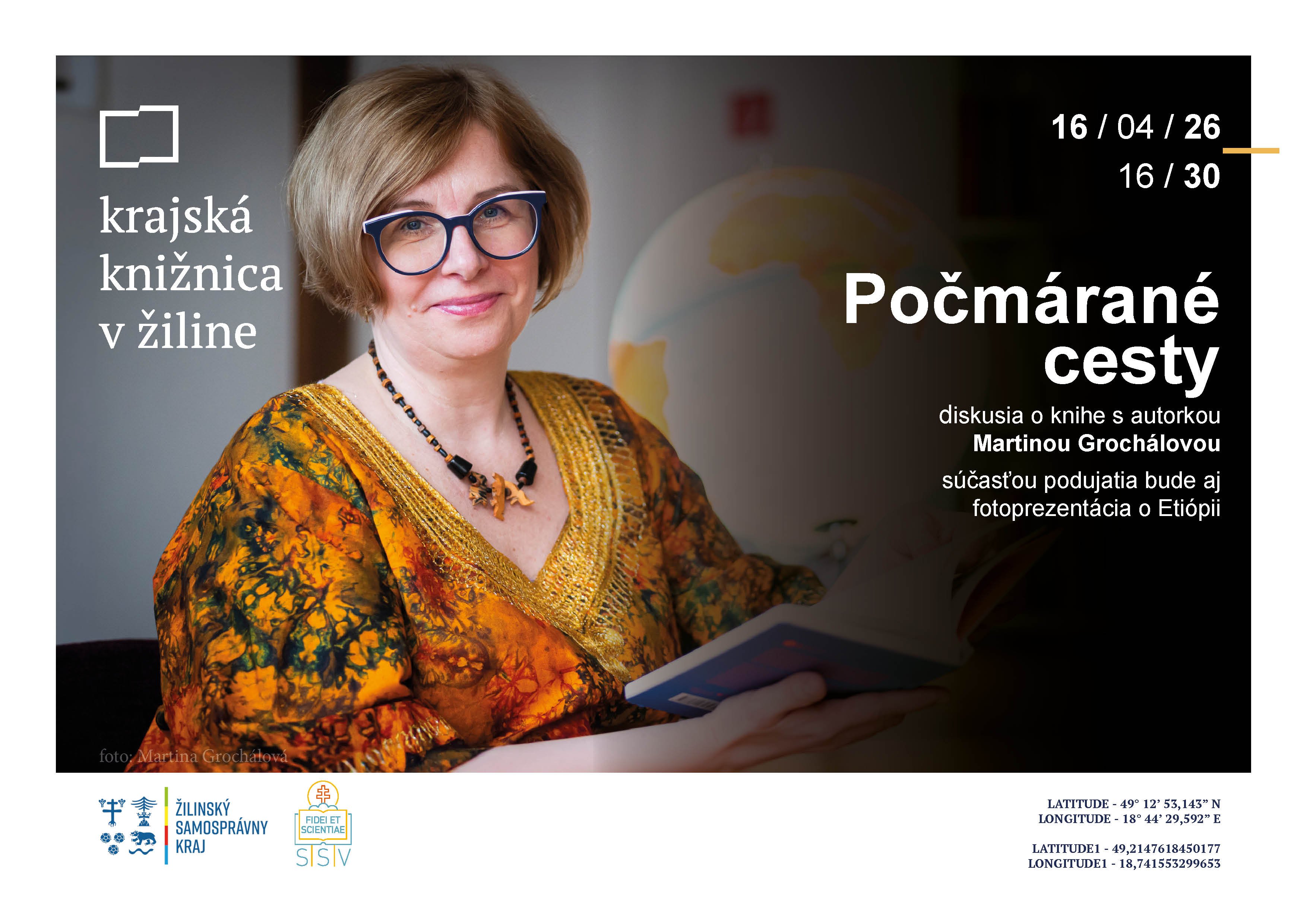 Pozývame vás na diskusiu s autorkou Martinou Grochálovou, ktorá vám predstaví svoju knihu Počmárané cesty. Prostredníctvom pútavých cestovateľských reportáží vás zavedie do rozmanitých kútov sveta a priblíži zážitky, ktoré formujú pohľad na rôzne kultúry. Súčasťou podujatia bude aj jedinečná fotoprezentácia venovaná fascinujúcej krajine Etiópia, ktorá doplní rozprávanie o autentické vizuálne momenty z ciest. Príďte sa inšpirovať a objavovať svet z novej perspektívy vo štvrtok 16. apríla o 16:30 v priestoroch Krajská knižnica v Žiline.
