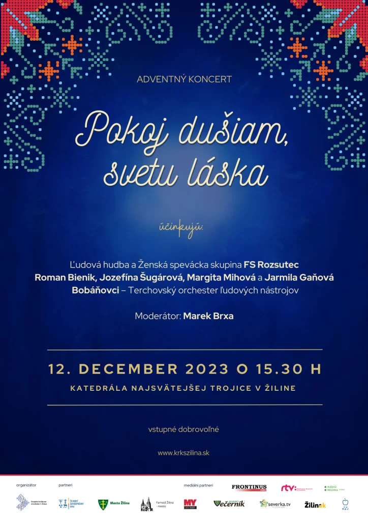 Krajské kultúrne stredisko v Žiline pozýva všetkých ľudí dobrej vôle na adventný koncert Pokoj dušiam, svetu láska, ktorý sa uskutoční v Katedrále Najsvätejšej Trojice v Žiline 12. decembra 2023 o 15.30 h.