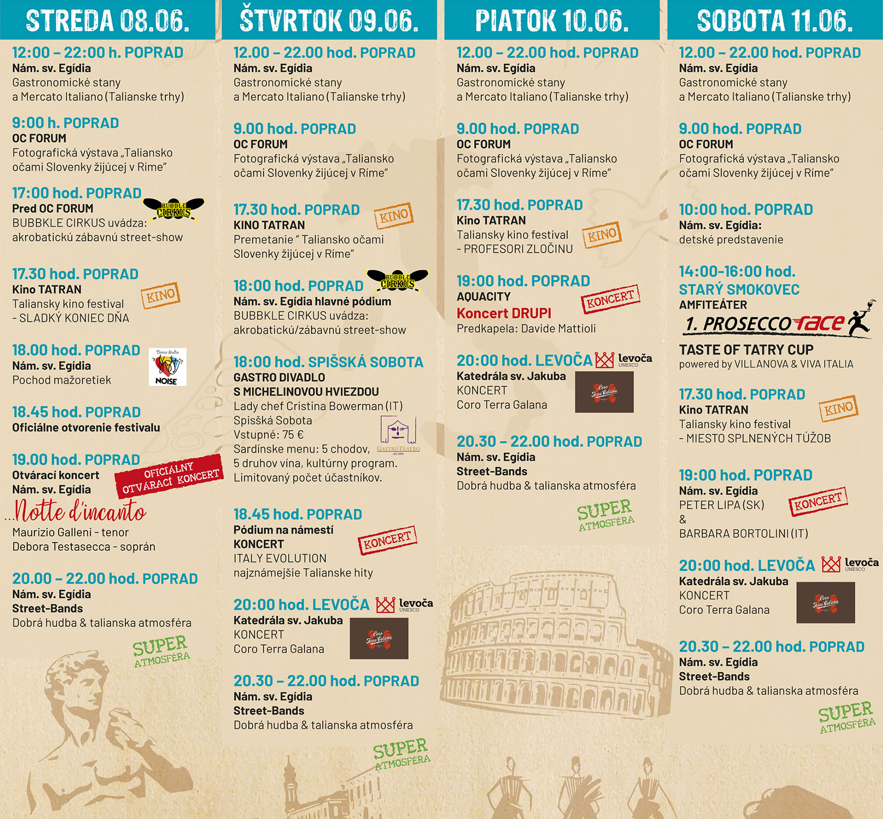 Pozývame vás na 9. ročník najväčšieho talianskeho festivalu na Slovensku Viva Italia. Počas 4 dní zažijete v Poprade pravú taliansku atmosféru. Príďte ochutnať prosecco, šťavnaté olivy, kvalitné espresso, sladké canoli, chutné cestoviny a mnoho ďalšieho.
