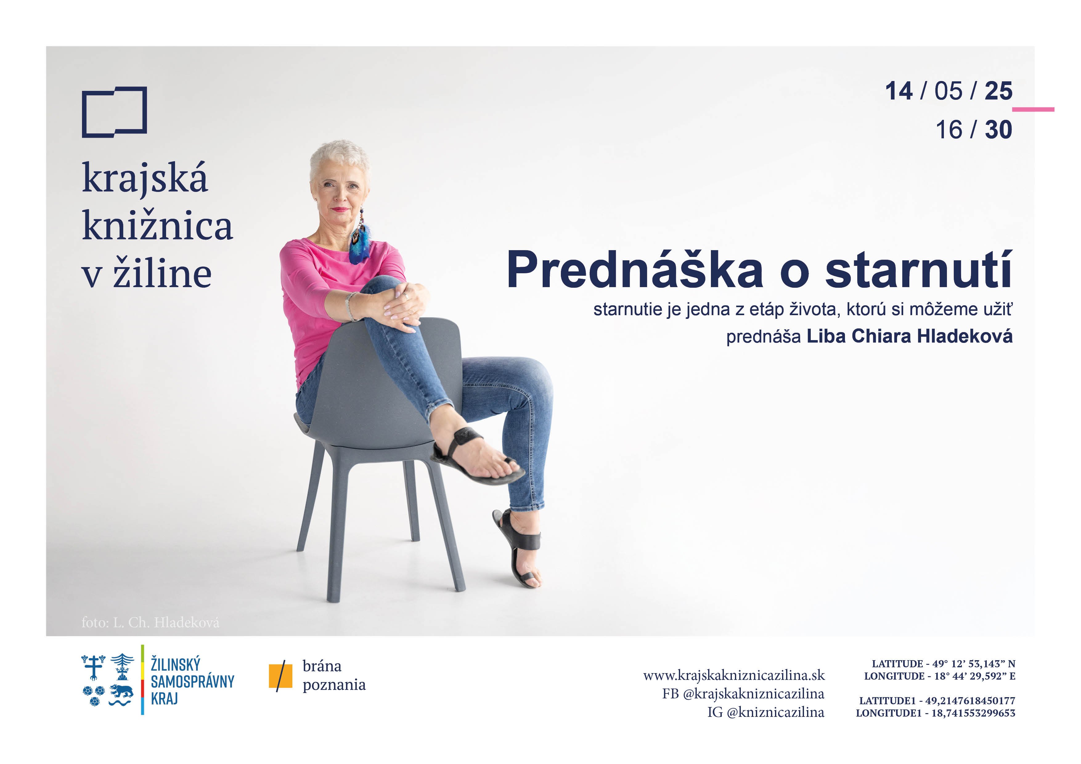 Aký je demografický vývoj Slovenska a vyplývajúce riziká? Aké sú riziká starnutia? Poznáte faktory, ktoré nás udržiavajú nielen pri živote, ale aj v zdraví a dobrej nálade? Nenechajte si ujsť prednášku v stredu 14. mája o 16:30 v Krajskej knižnici v Žiline. Dozviete sa nielen to, že starnutie je jedna z etáp života, ktorú si môžeme užiť, ale aj to, kedy sa začať zamýšľať a pripravovať. Prednášku bude viesť trénerka pamäti a koučka Liba Chiara Hladeková.