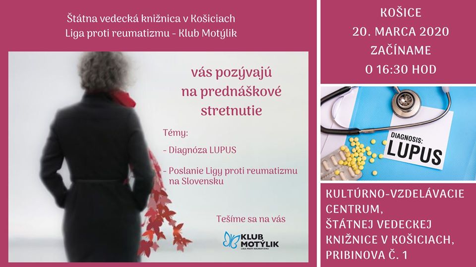 Štátna vedecká knižnica v Košiciach Vás pozýva na prednáškové stretnutie ohľadom diagnózy Lupus, ktoré pripravila Liga proti reumatizmu - Klub Motýlik.