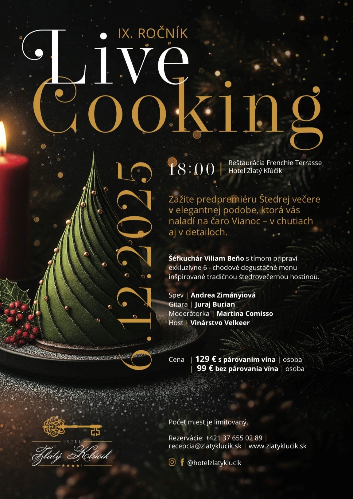 Doprajte si predpremiéru Štedrej večere v elegantnej podobe, ktorá vás naladí na čaro Vianoc – v chutiach aj v detailoch. Pozývame vás na špeciálnu predvianočnú edíciu gastronomického podujatia Live Cooking, kde sa snúbi elegancia špičkovej gastronómie s emóciou živej hudby.