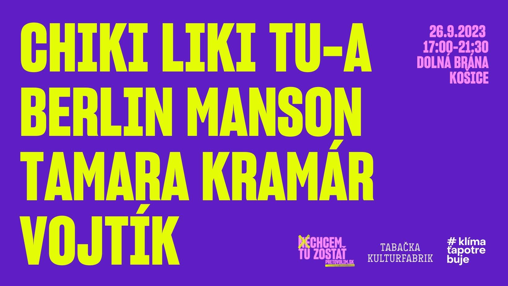 V rámci občianskej mobilizačnej kampane CHCEM TU ZOSTAŤ vystúpia v utorok 26.9. od 17:00 na Dolnej bráne v Košiciach okrem množstva zaujímavých rečníkov aj kapely CHIKI LIKI TU-A, BERLIN MANSON, TAMARA KRAMÁR a VOJTÍK.