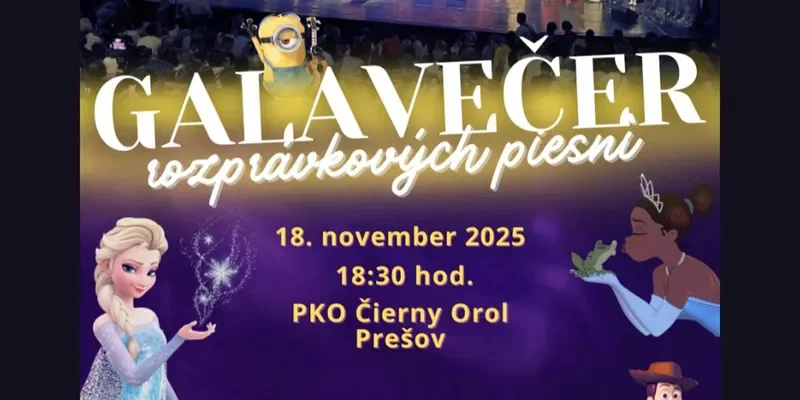 Po veľkom úspechu Galavečera muzikálových piesní prichádza Prešovský orchester mladých s novým koncertným programom – Galavečer rozprávkových piesní. Budete mať možnosť počuť najznámejšie skladby z domácich aj zahraničných rozprávok – Ľadové kráľovstvo, Príbeh hračiek, Ja zloduch, Na vlásku, Gumkáči, Káčerovo, či staré overené rozprávkové hity, ktoré milujú všetky generácie, ako sú Bambuľka, či Spadla z oblakov. To všetko zaznie v podaní 100-členného orchestra, ktorý je ešte väčší a bohatší o nové posily, speváckeho zboru a sólistov zo Súkromného konzervatória Prešov. Energia tohto obrovského zoskupenia mladých umelcov vám zaručuje opäť neopakovateľný zážitok.