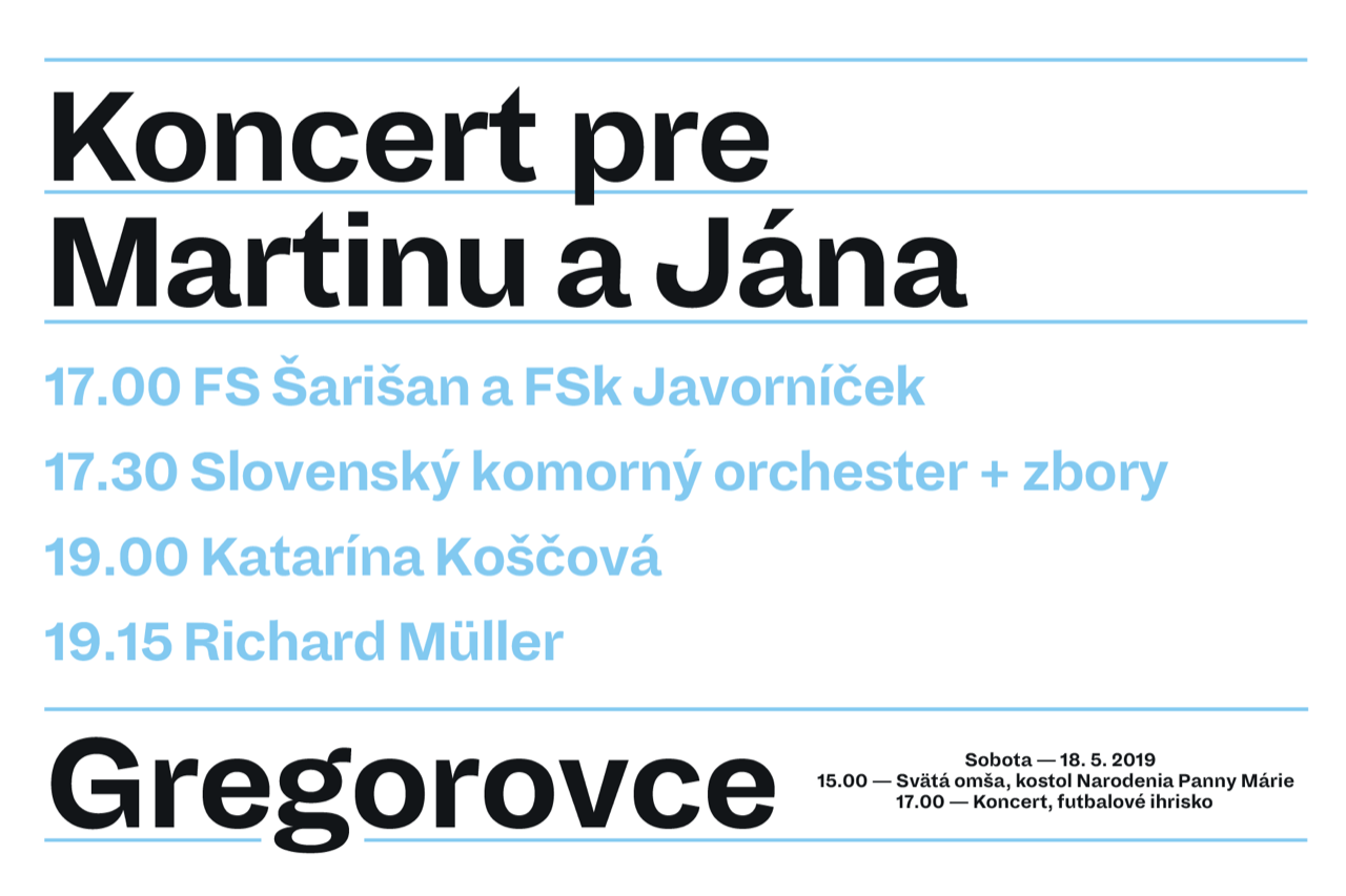 Richard Müller, Katarína Koščová, Slovak chamber orchestra - Slovenský komorný orchester, zbory z celého Slovenska, Folklórny Súbor Šarišan, FSk Javorníček a vystúpia v sobotu 18. mája na Koncerte pre Martinu a Jána v Gregorovciach. Koncert sa uskutoční na výročie plánovaného sobáša Martiny Kušnírovej a Jána Kuciaka ako prejav spolupatričnosti s ich blízkymi.