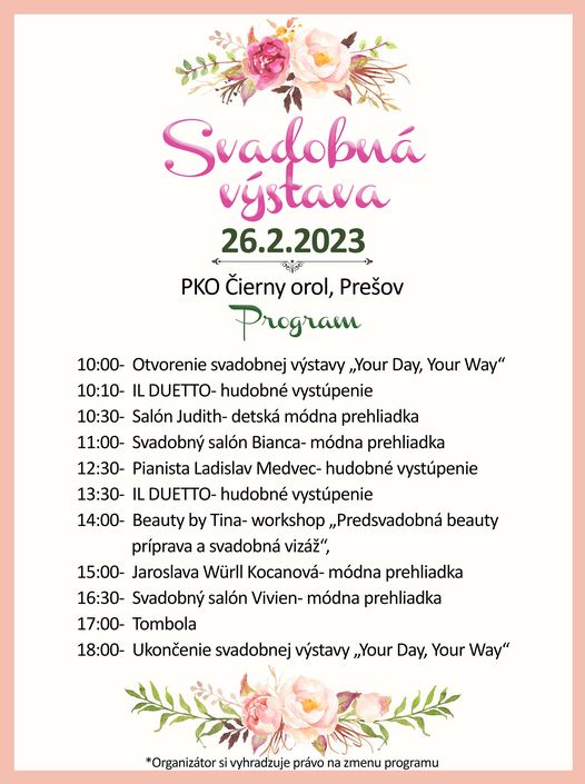 Pozývame Vás na 5. ročník Svadobnej výstavy " Your day, your way" do Prešova, kde sa môžete tešiť na exkluzívnych dodávateľov zo svadobnej oblasti, sprievodný program ako módne prehliadky, hudobné vystúpenia a samozrejme možnosť vyhrať skvelé ceny!