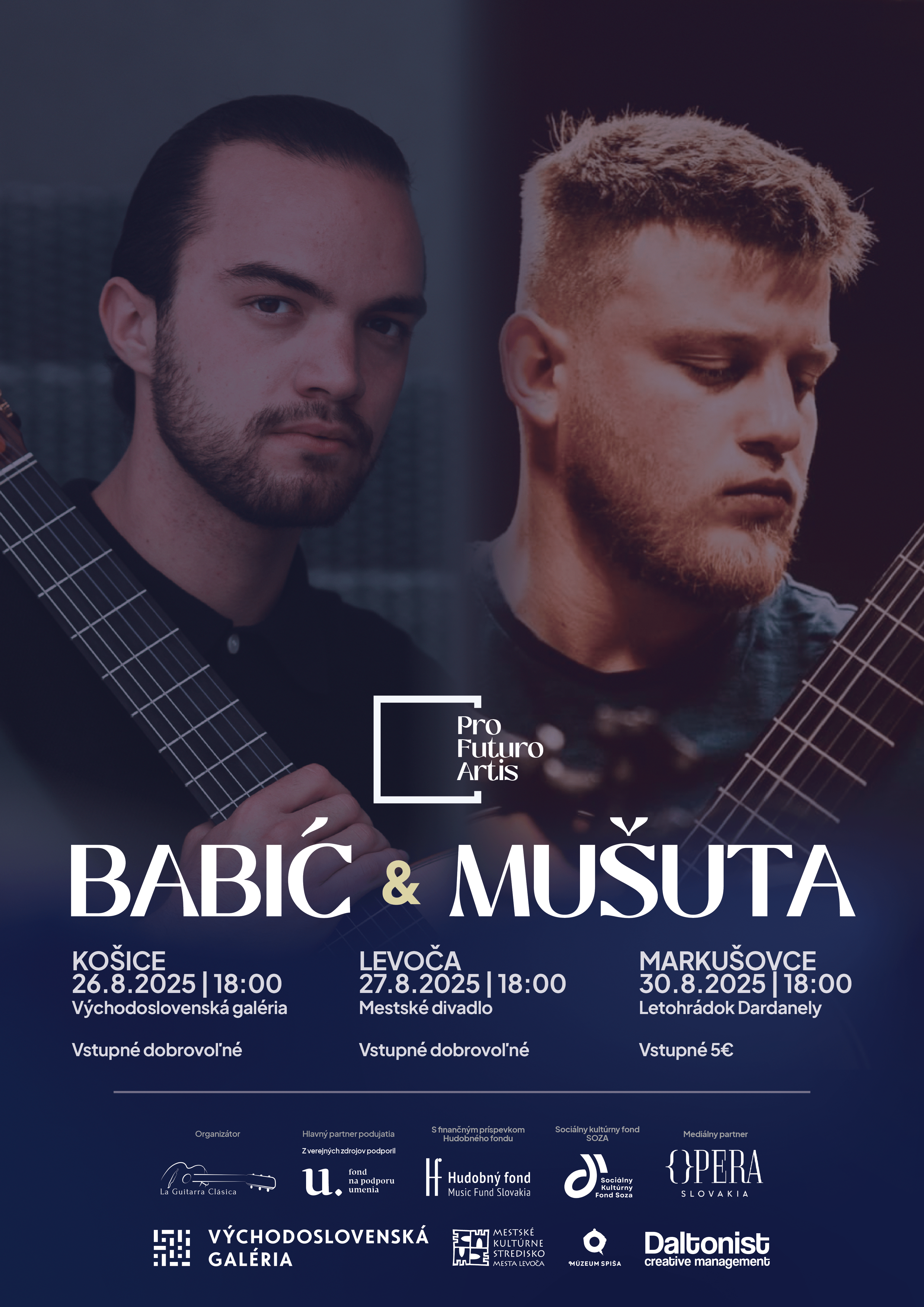 Koncom augusta sa projekt Pro Futuro Artis presunie do východoslovenského regiónu, kde ako duo vystúpia pozoruhodní gitaristi Filip Babić a Augustín Mušuta. Ich spoločné koncerty zaznejú 26. augusta v Historickej sále Východoslovenskej galérie v Košiciach, 27. augusta v Divadelnej sále Mestského divadla v Levoči a 30. augusta v letohrádku Dardanely v Markušovciach. . Obaja patria k talentovanej mladej generácii a ich interpretácie diel Sérgia Assada, Manuela Castelnuovo-Tedesca, Lea Brouwera a Máxima Diega Pujola sľubujú nezabudnuteľné hudobné zážitky. Spoluorganizátorom tohto podujatia je MsKS mesta Levoča. Vstupné dobrovoľné.