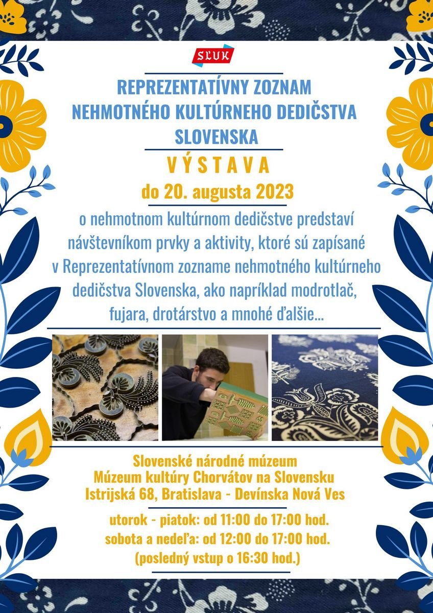 Výstava o nehmotnom kultúrnom dedičstve predstaví návštevníkom prvky a aktivity, ktoré sú zapísané v Reprezentatívnom zozname nehmotného kultúrneho dedičstva Slovenska, ako napríklad modrotlač, fujara, drotárstvo a mnohé ďalšie...