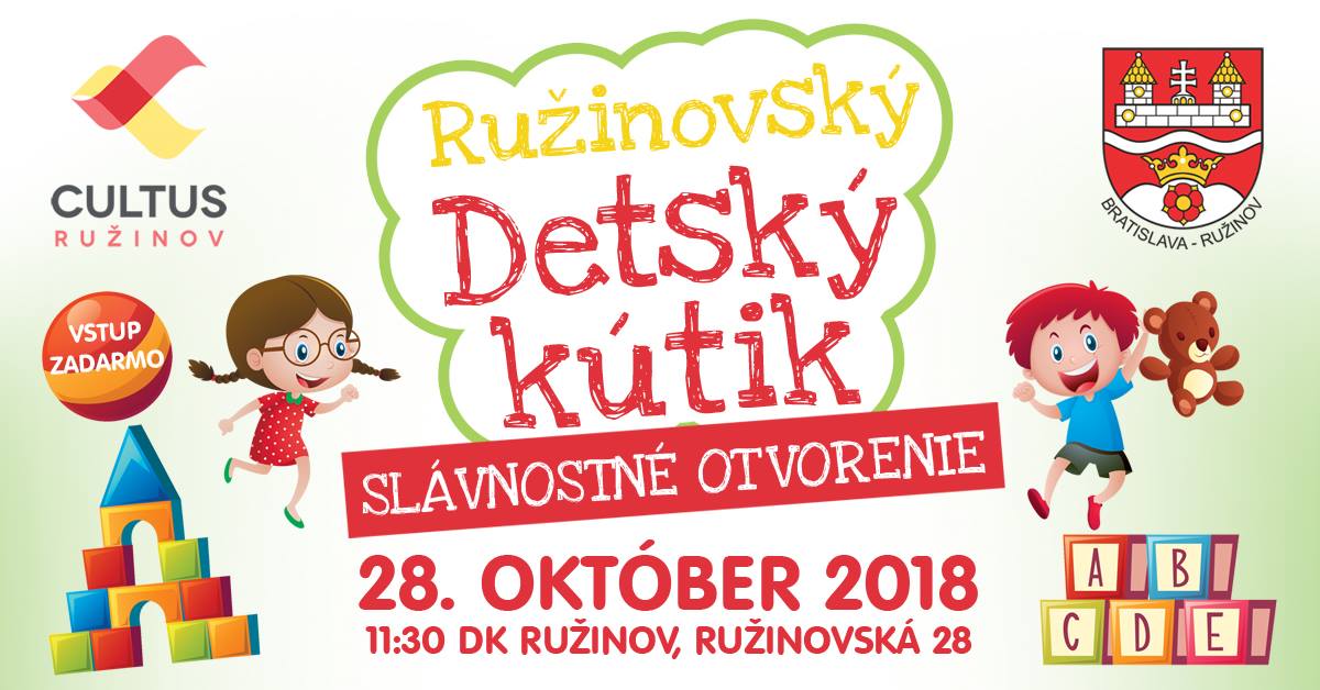 Mestská časť Bratislava - Ružinov a Cultus Ružinov pozývajú malých aj veľkých Ružinovčanov na slávnostné otvorenie novéhoRužinovského detského kútika, ktoré sa koná 28. októbra 2018 v Dome kultúry Ružinov.
