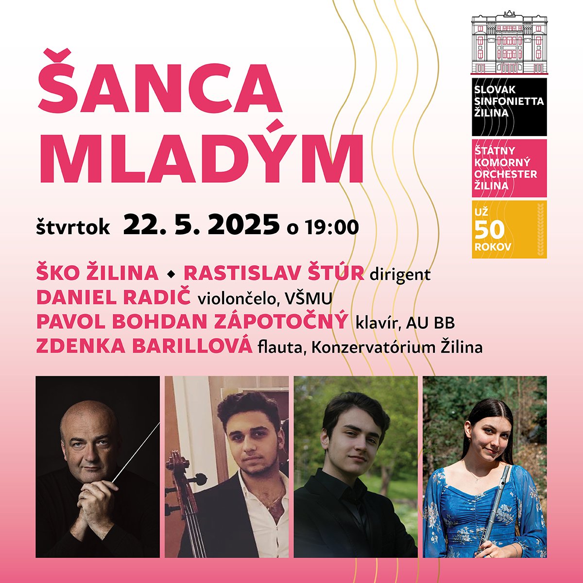 Tradičný koncert najlepších absolventov a študentov žilinského konzervatória a slovenských vysokých hudobných škôl, ktorí si overia svoje sily a sólistické schopnosti s orchestrom, tentokrát pod vedením medzinárodne renomovaného slovenského dirigenta Rastislava Štúra.