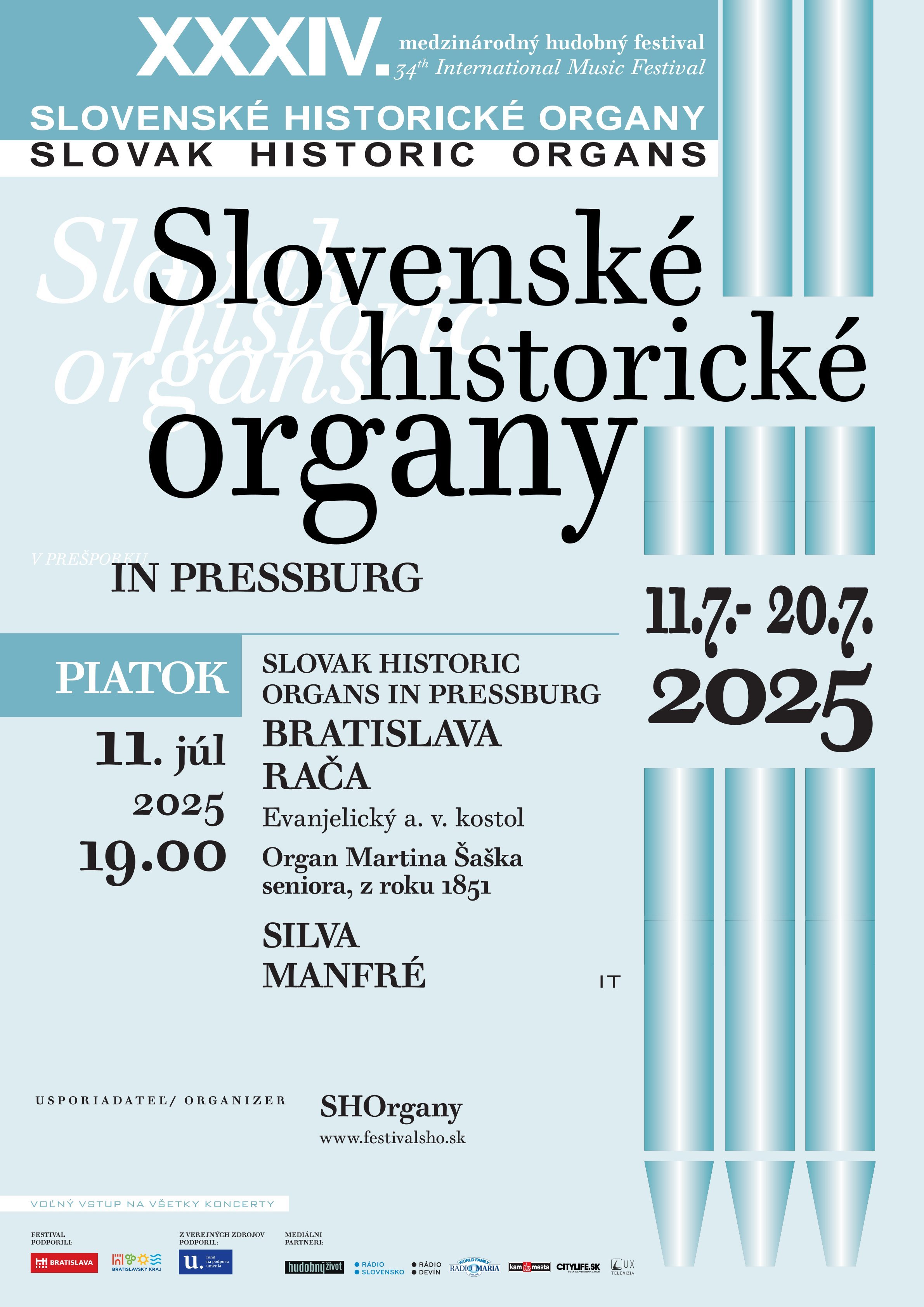 Medzinárodný hudobný festival Slovenské historické organy/Slovak historic organs otvára svoj 34. ročník. Od 11. júla do 20. júla sa uskutoční päť koncertov na historických organoch v rôznych miestach Slovenska. Tento festival medzinárodného významu vznikol v roku 1992, s cieľom upozorniť na historickú hodnotu organov na Slovensku prostredníctvom koncertov s medzinárodným obsadením. Od roku 2021 je súčasťou dramaturgie aj edícia Slovak historic organs in Pressburg, ktorá predstavuje píštalové nástroje Bratislavy a okolia.