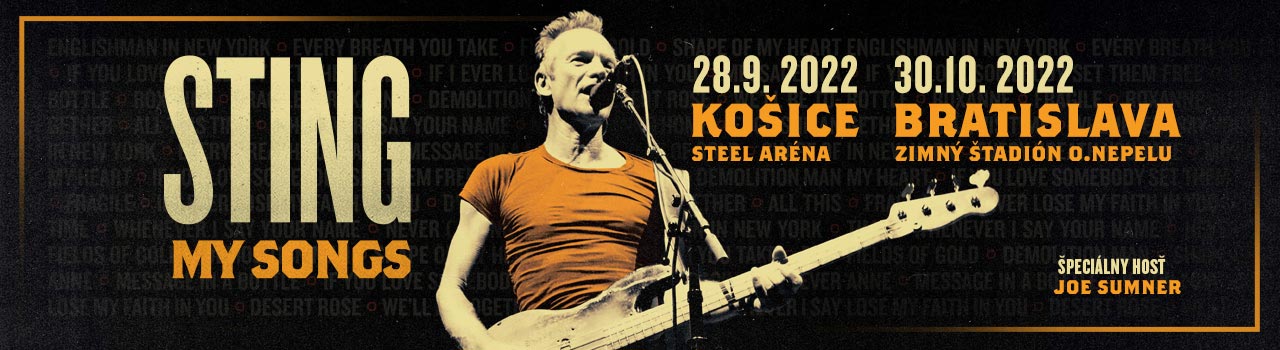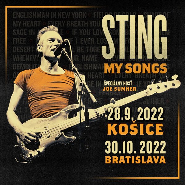 17-násobný držiteľ ceny Grammy odohrá skladby ako „Fields of Gold“, „Shape of My Heart“,„Englishman in New York“či „Every Breath You Take“a veľa ďalších, ktoré napísal počas svojej plodnej kariéry, či už so skupinou The Police, alebo ako sólový umelec. Tentokrát odohrá koncert MY SONGS v košickej Steel Aréne 28.9.2022 aj na bratislavskom Zimnom štadióne Ondreja Nepelu 30.10.2022.