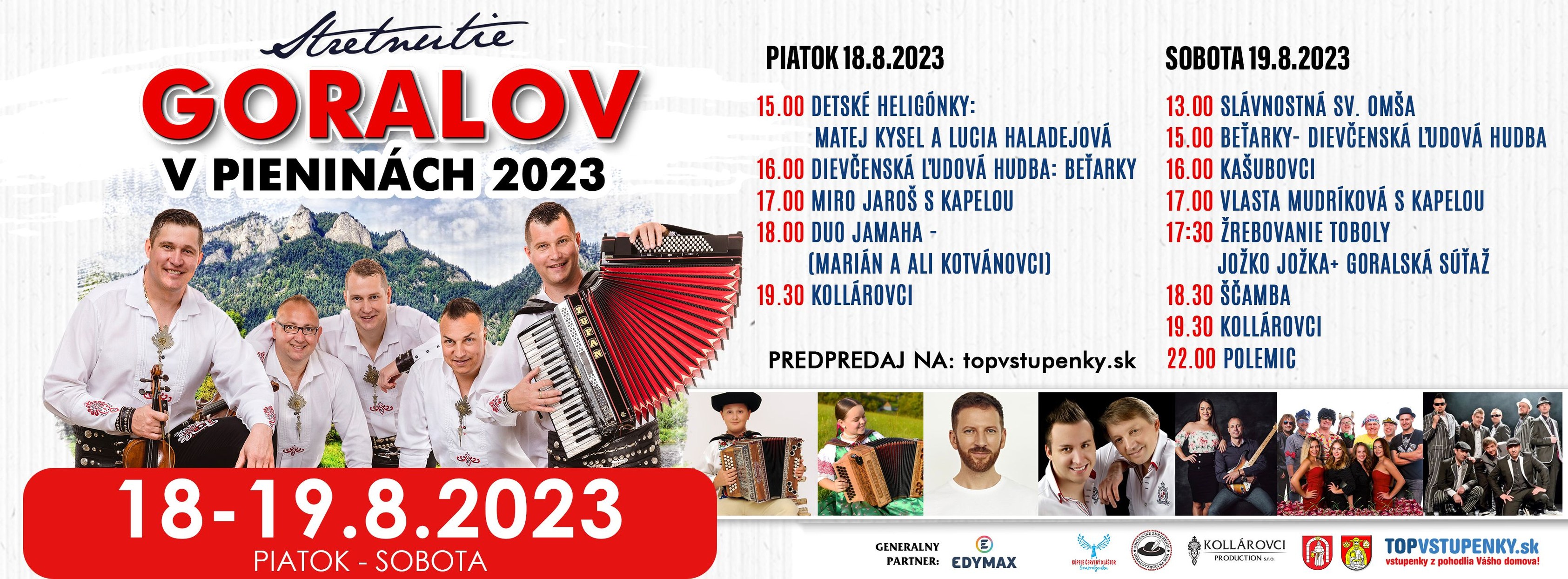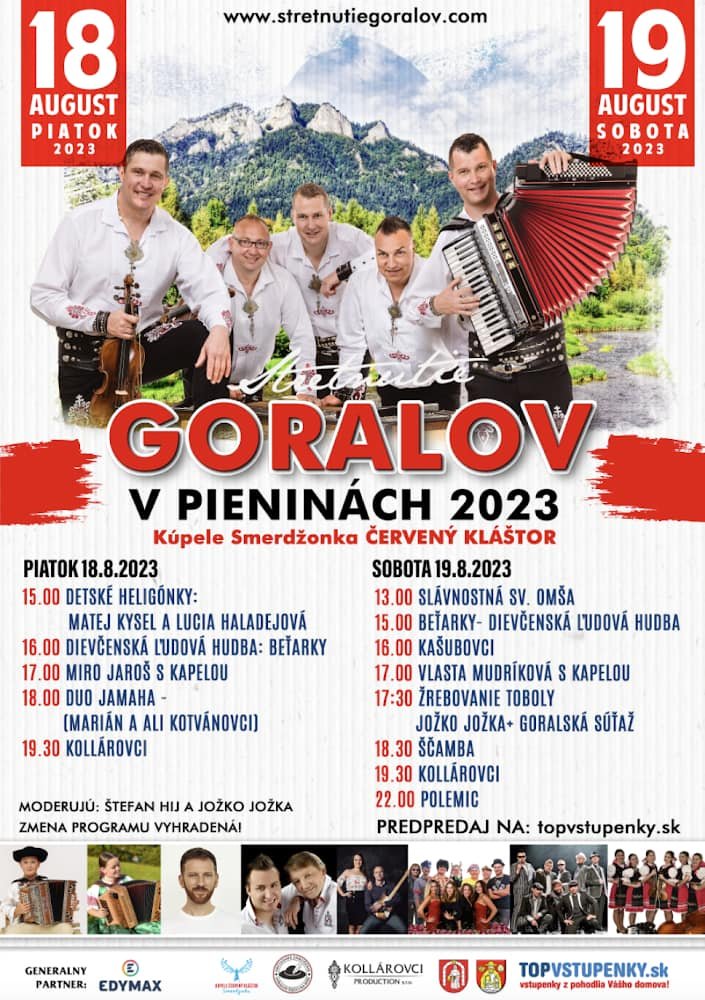Príďte sa zabaviť na jedinečné podujatie: Stretnutie Goralov v Pieninách 2023, ktoré sa uskutoční piatok 18.8.2023 a sobotu 19.8.2023. Zažite s nami neopakovateľnú atmosféru v nádhernom areáli v kúpeľoch Šmerdžonka, Červený Kláštor v srdci Pieninského národného parku. Open Air akcia, podujatie sa koná za každého počasia. V prípade daždivého počasia, nepoužívať dáždniky, ale pršiplášte. Zákaz vstupu so psom a zvieraťom.