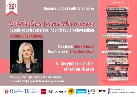 Pozývame vás do záhradnej čitárne na stretnutie s Ivanou Havranovou. Je autorkou niekoľkých stoviek televíznych scenárov a autorkou 50 kníh. Moderátorkou večera bude Alena Beňová, hudba a spev Lívia Doležalová.
