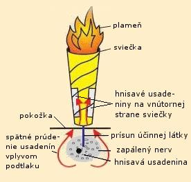 Princíp fungovania: Sviečku zapálime na hornom, širšom okraji a priložíme na postihnuté miesto. Teplo zmäkčuje nahromadené usadeniny, pozitívne ovplyvňuje prípadné zablokované toky energie, obnoví sa prúdenie tekutín medzi bunkami. Cez rozšírené póry kože sa dostanú do zablokovaných tokov výťažky liečivých rastlín a esenciálne oleje. Podtlak vytiahne rozpustené usadeniny a hnisavý odpad z tela na stenu sviečky.