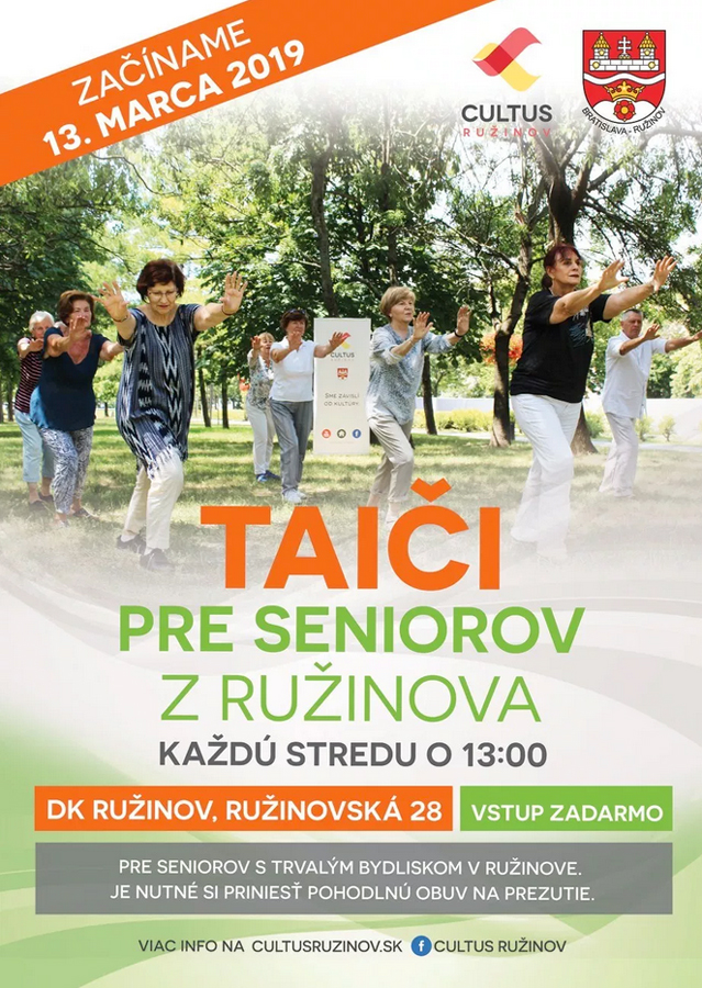 Tentokrát si na svoje prídu priaznivci cvičenia taiči. Cvičenia taiči budú prebiehať každú stredu o 13:00 v Dome kultúry Ružinov, Ružinovská 28. Skupinové cvičenia sú určené pre seniorov s trvalým bydliskom v Ružinove.