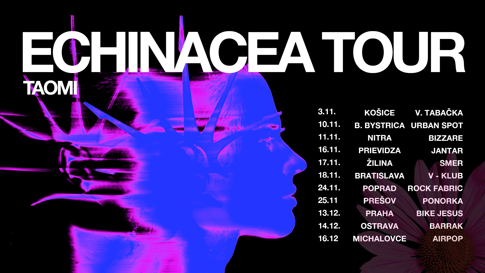 Po takmer trojročnej odmlke predstavil Taomi začiatkom tohto leta svoj nový album Echinacea, z ktorého pochádzajú úspešné singel ako „Ty (Tomáš)“ a „Kúsok mňa“. Aktuálne sa s novým albumom vydáva na svoje prvé sólové turné po slovenských a českých mestách. Príďte si užiť hudobne a vizuálne nabitú show plnú známych hitov a hudobných hostí.
