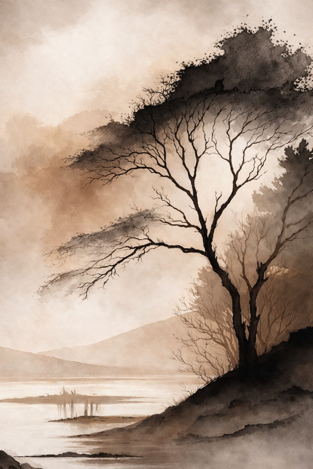Kávové lazúry vytvárajú mäkké prechody medzi nebom, vzdialenými kopcami a pokojnou hladinou jazera. Odtiene od svetlej béžovej po hlbokú hnedú dodávajú dielu prirodzenú hĺbku a nostalgickú atmosféru. V pozadí sa črtajú siluety stromov zahalené v hmle, čo obrazu dodáva pocit ticha a ranného pokoja.