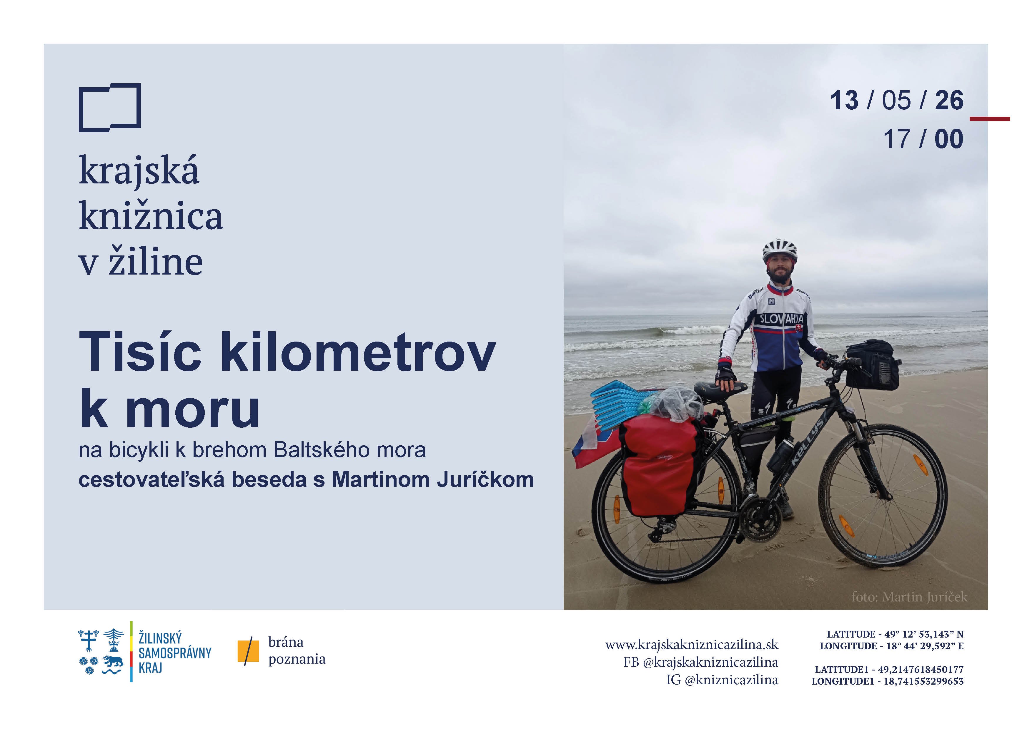 Vydajte sa s nami cez Jeseníky k nekonečným poľským rovinám v stredu 13. mája o 17:00 v Krajskej knižnici v Žiline. Zažijete atmosféru františkánskeho kláštora v historickom Wroclawe, naplno spoznáte poľskú pohostinnosť, budeme nasávať vôňu perníkového cesta v meste Toruň a tajiť dych nad majestátnosťou gotického hradu Malbork a napokon si vypočujeme šumenie vĺn Baltského mora. Cestovateľská beseda s Martinom Juríčkom, známym pútnikom, ktorý mal nedávno besedu v knižnici s názvom: Na bicykli z Bratislavy do španielskej Compostely.